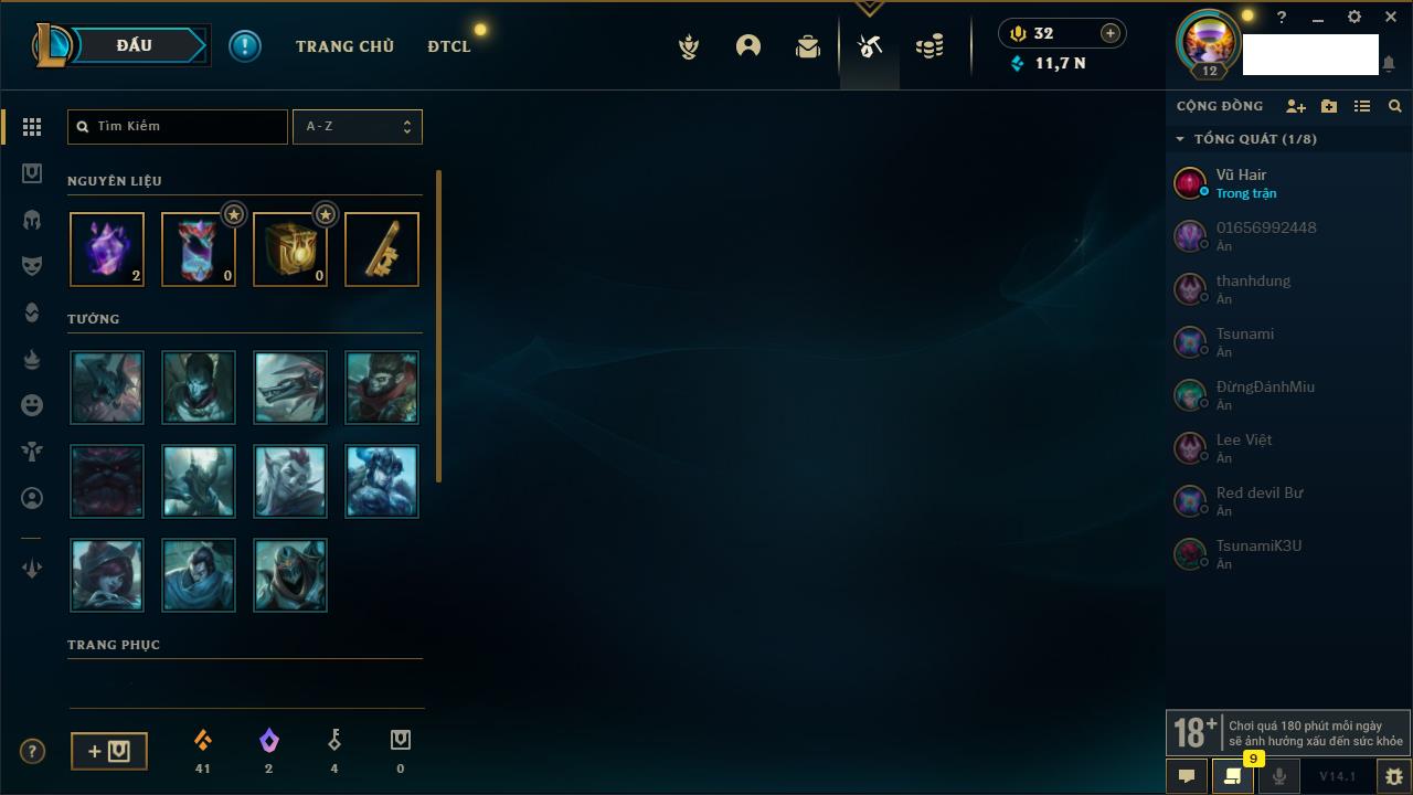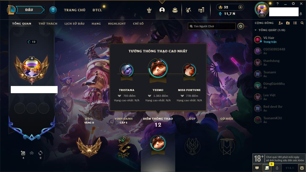 Rank Đơn: Chưa rank mùa nào Khung: Chưa có khung Tướng: 166 - Còn 3090 THX Trang Phục: 9 Rank ĐTCL: Chưa Rank Linh Thú: 125