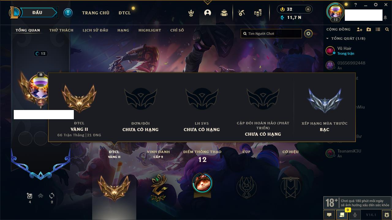 Rank Đơn: Sắt III Khung: Chưa có khung Tướng: 63 - Còn 185 THX Trang Phục: 8 Rank ĐTCL: Chưa Rank Linh Thú: 75