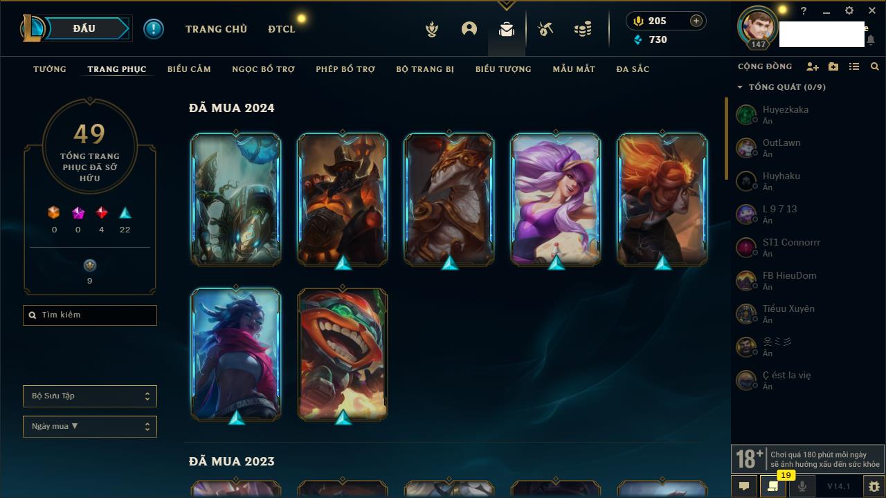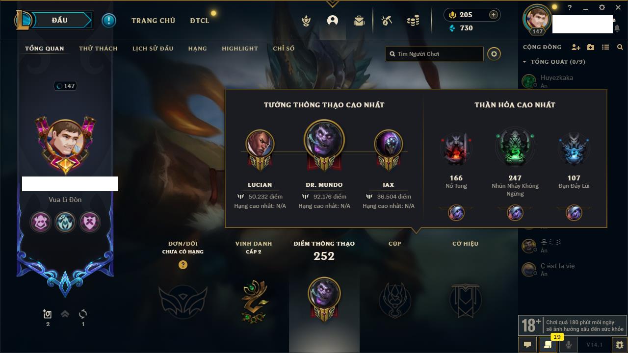 Rank Đơn: Chưa rank mùa nàoKhung: Chưa có khungTướng: 158 - Còn 7570 THXTrang Phục: 5Rank ĐTCL: Chưa RankLinh Thú: 45