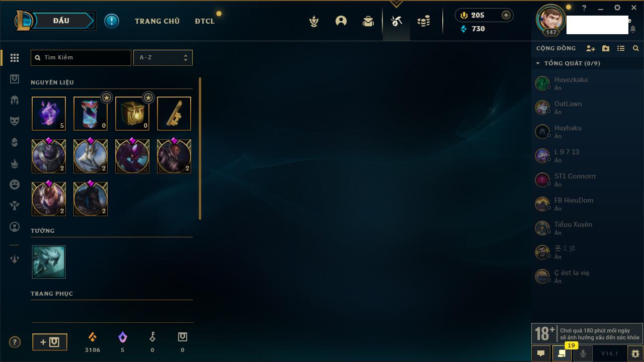 Rank Đơn: Chưa rank mùa nàoKhung: Chưa có khungTướng: 0 - Còn 0 THXTrang Phục: 0Rank ĐTCL: Vàng IVLinh Thú: 10