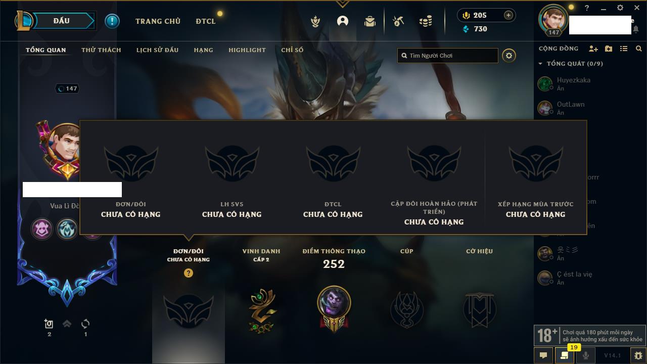Rank Đơn: Chưa rank mùa nàoKhung: Chưa có khungTướng: 157 - Còn 12600 THXTrang Phục: 0Rank ĐTCL: Chưa RankLinh Thú: 2