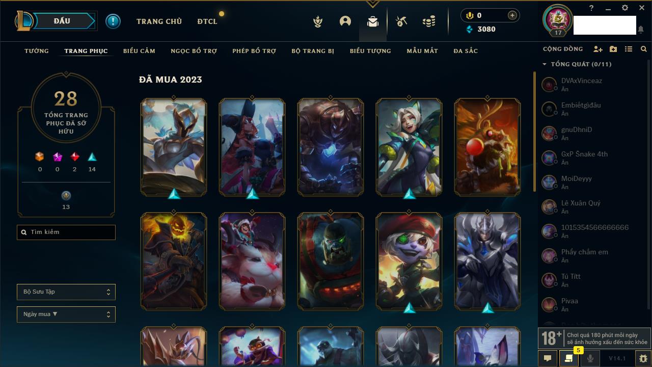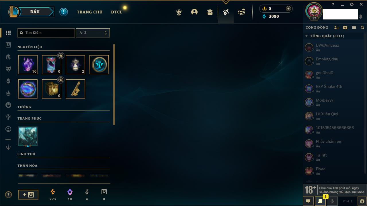 Rank Đơn: Chưa rank mùa nàoKhung: Chưa có khungTướng: 166 - Còn 3090 THXTrang Phục: 9Rank ĐTCL: Chưa RankLinh Thú: 125