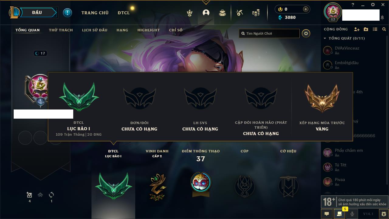Rank Đơn: Sắt IIIKhung: Chưa có khungTướng: 63 - Còn 185 THXTrang Phục: 8Rank ĐTCL: Chưa RankLinh Thú: 75