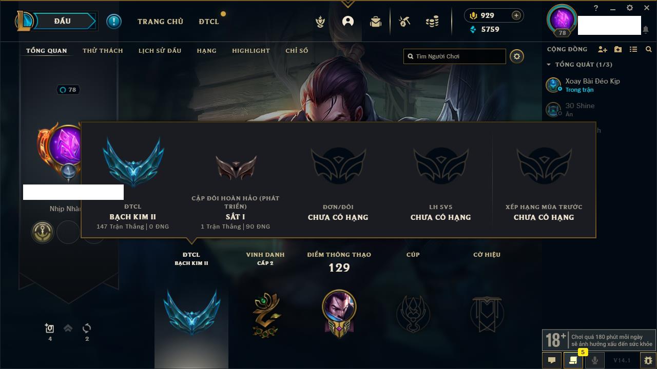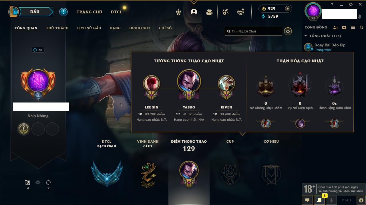 Rank Đơn: Bạc IV Khung: Bạc Tướng: 64 - Còn 5901 THX Trang Phục: 17 Rank ĐTCL: Chưa Rank Linh Thú: 105