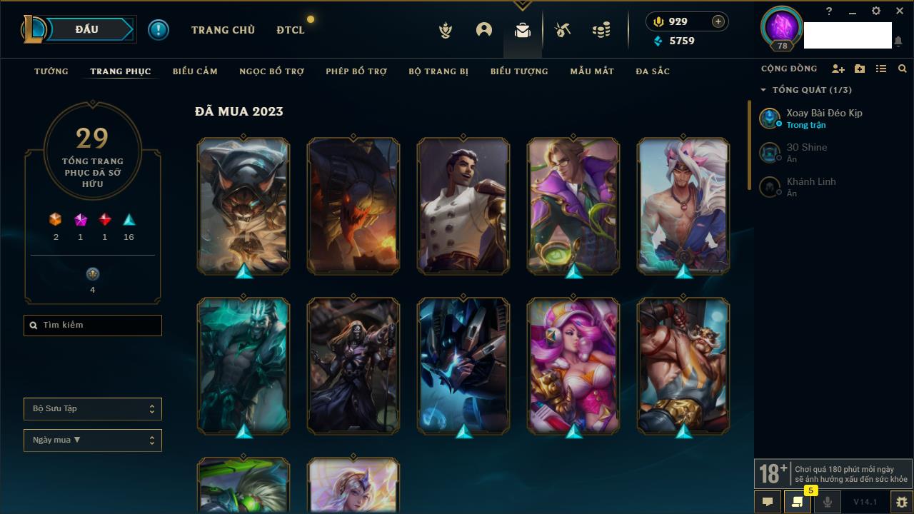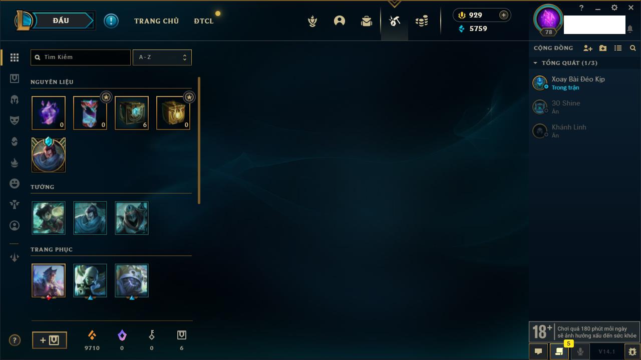 Rank Đơn: Chưa rank mùa nào Khung: Chưa có khung Tướng: 170 - Còn 3409 THX Trang Phục: 54 Rank ĐTCL: Chưa Rank Linh Thú: 170