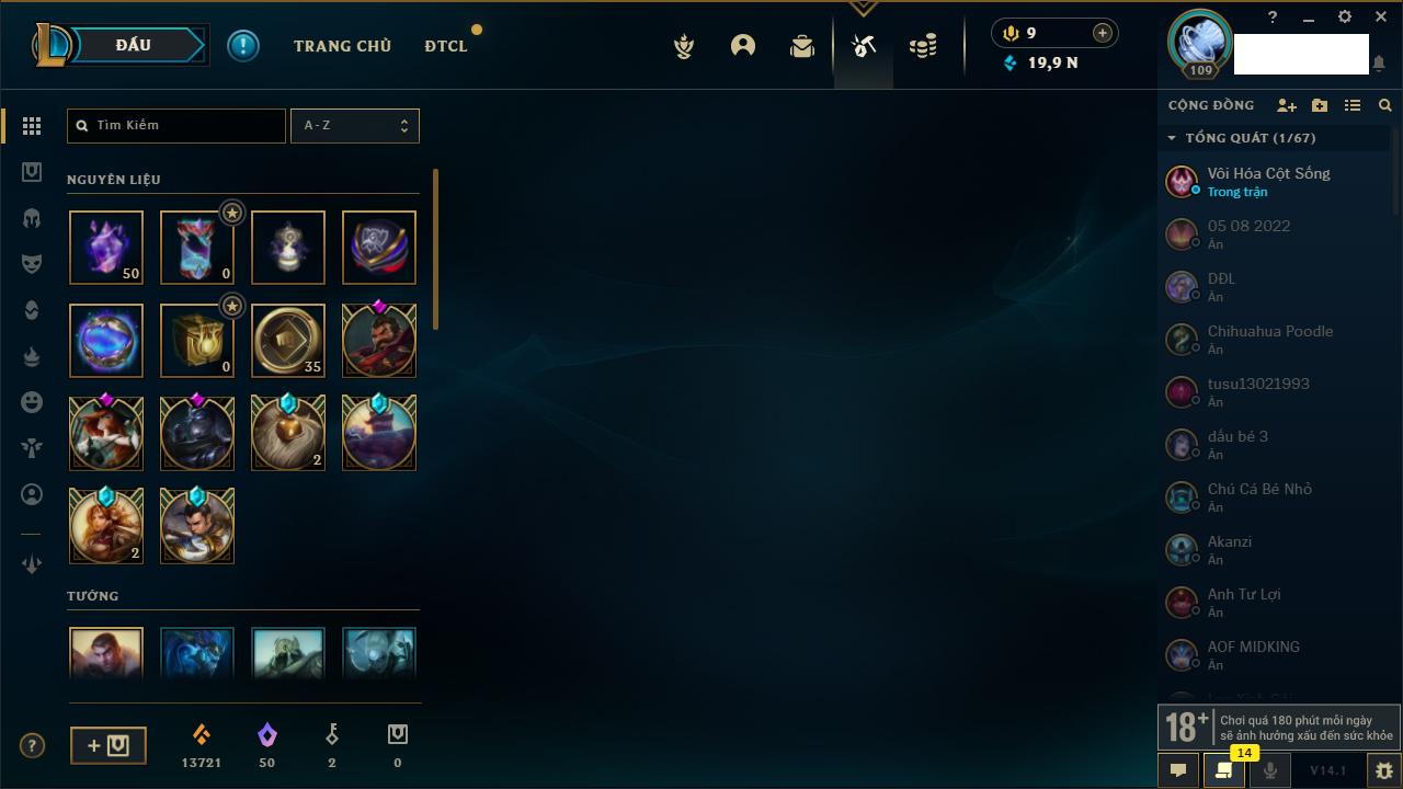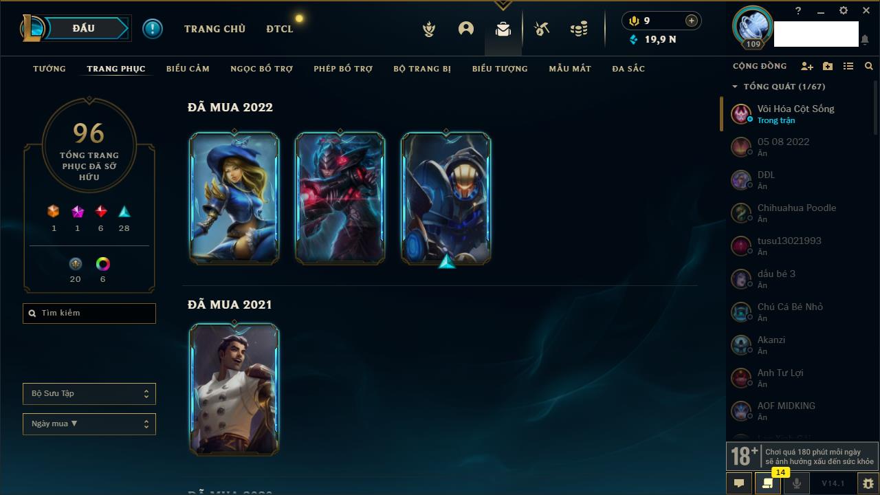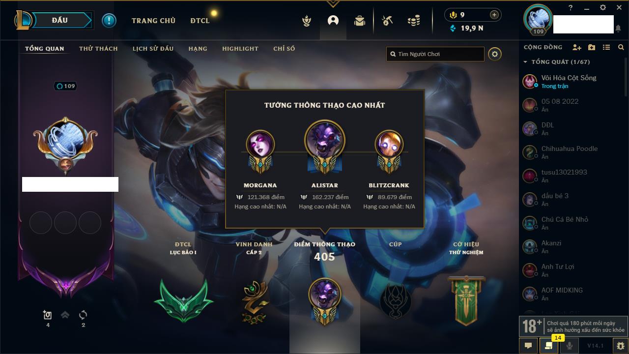Rank Đơn: Vàng IIIKhung: BạcTướng: 171 - Còn 101359 THXTrang Phục: 88Rank ĐTCL: Kim Cương IVLinh Thú: 200