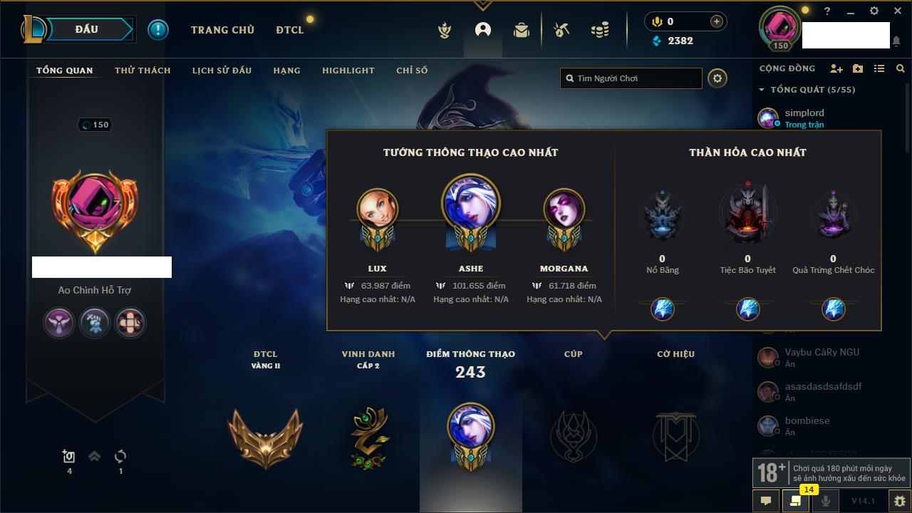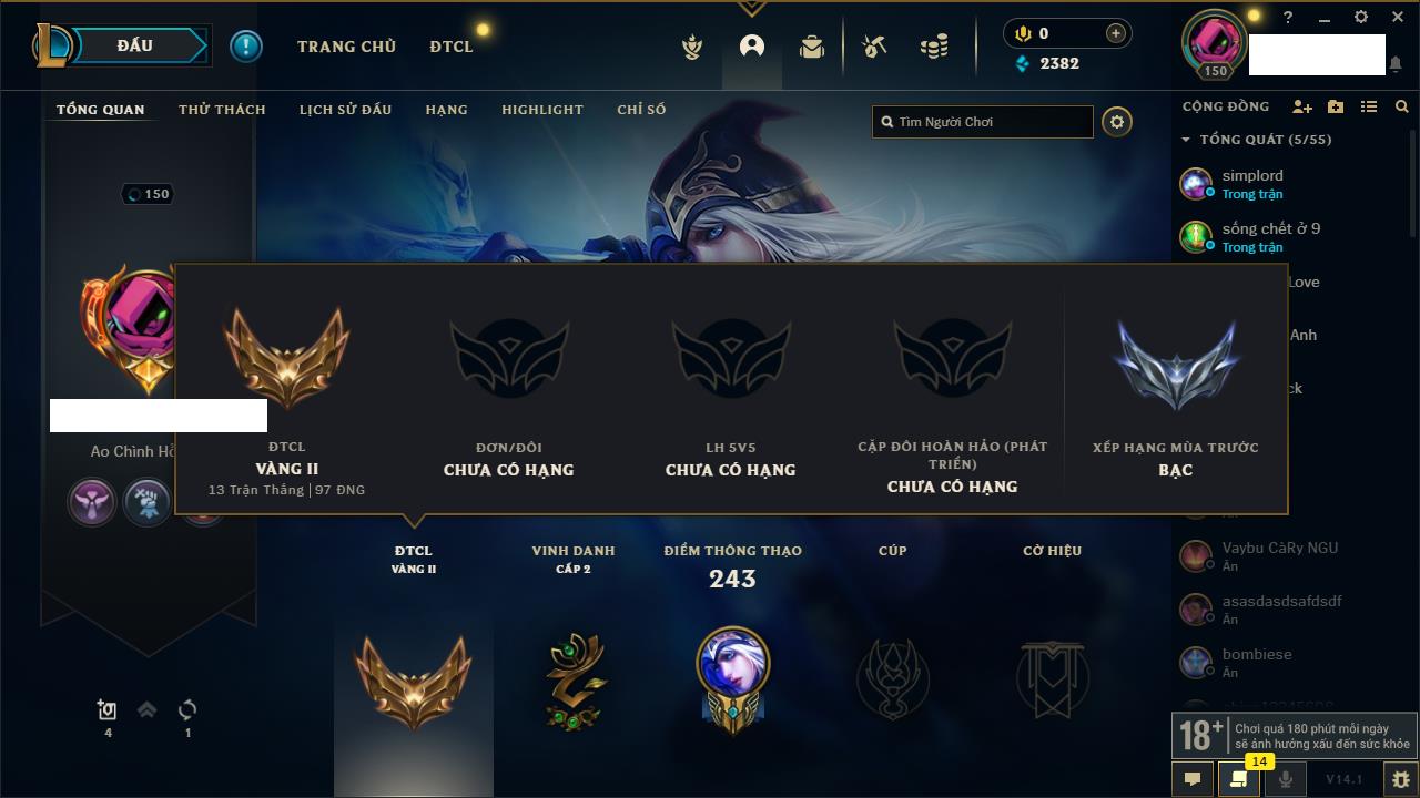 Rank Đơn: Đồng IKhung: Chưa có khungTướng: 130 - Còn 4038 THXTrang Phục: 151Rank ĐTCL: Chưa RankLinh Thú: 45