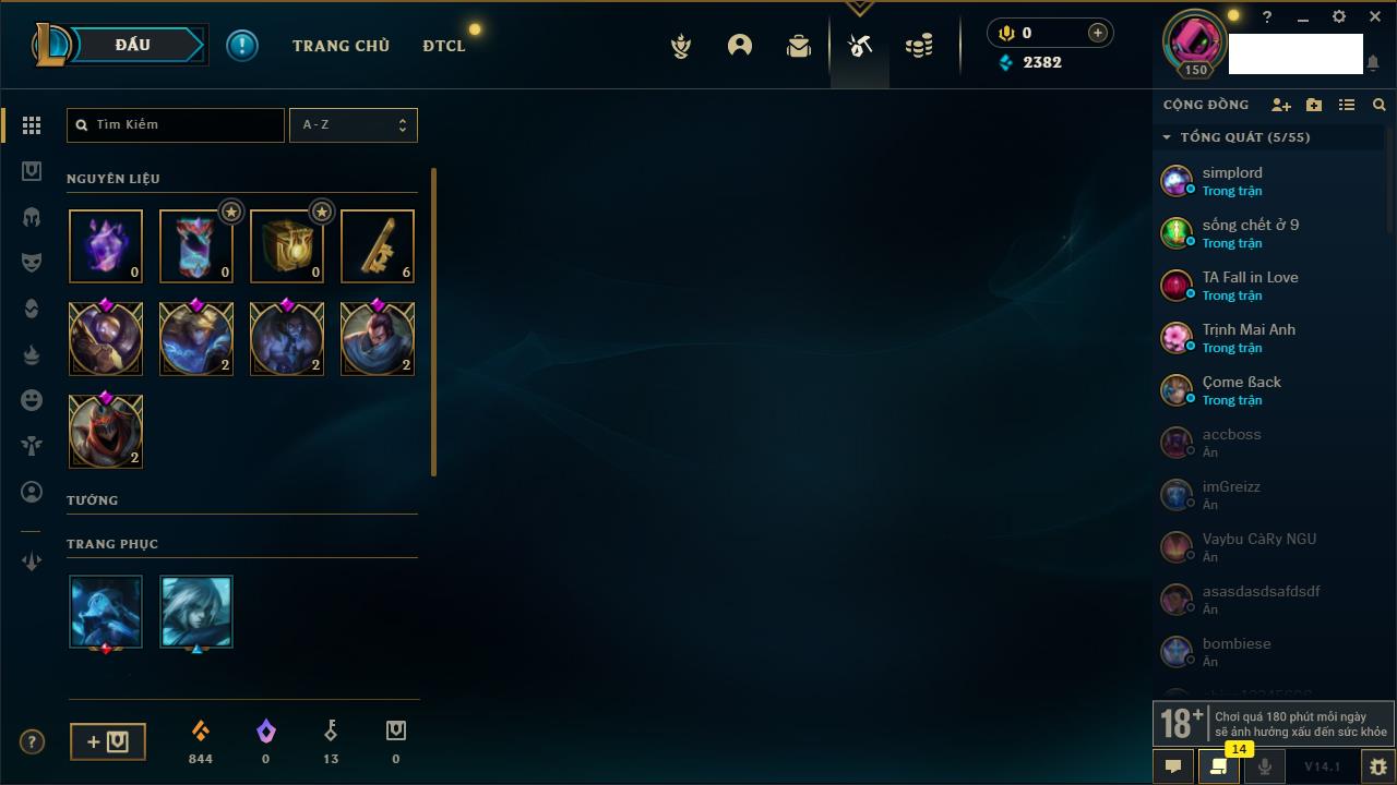 Rank Đơn: Chưa RankKhung: Chưa có khungTướng: 166 - Còn 81290 THXTrang Phục: 69Rank ĐTCL: Chưa RankLinh Thú: 53