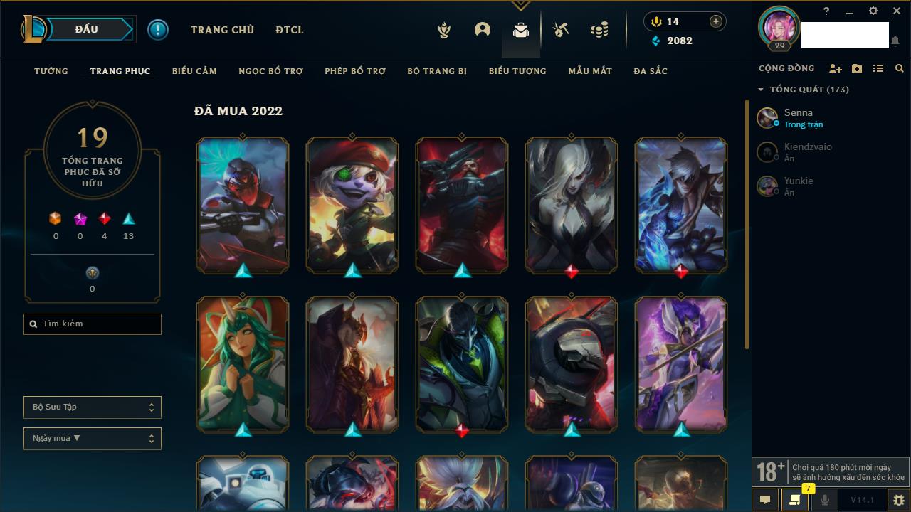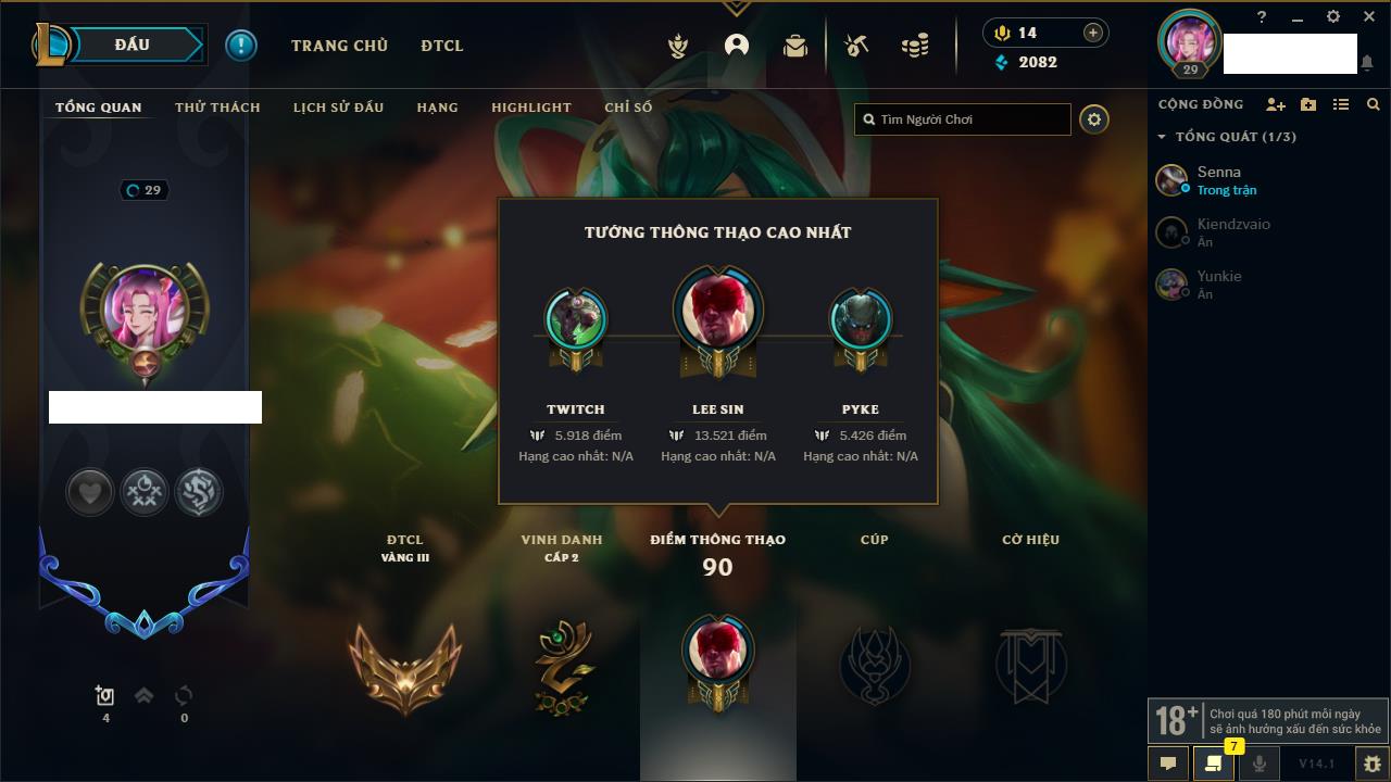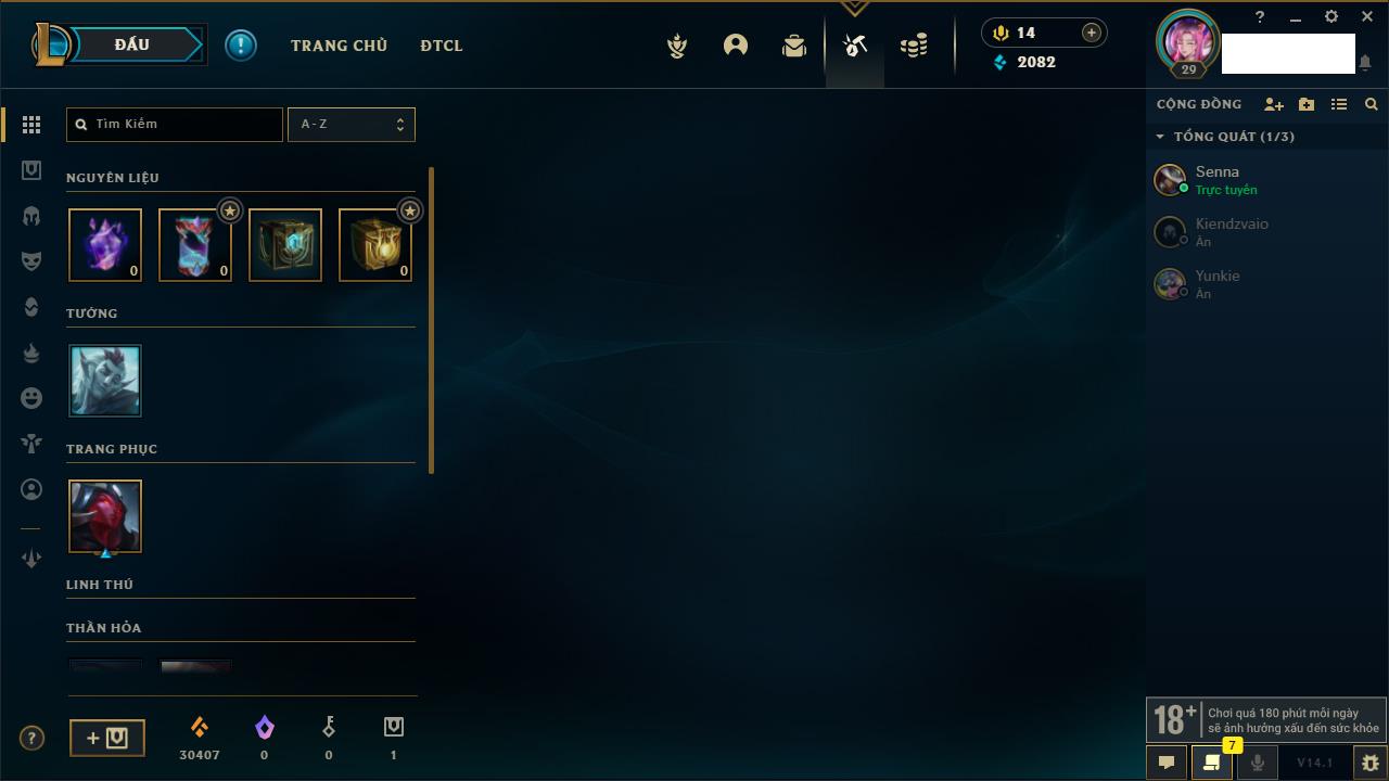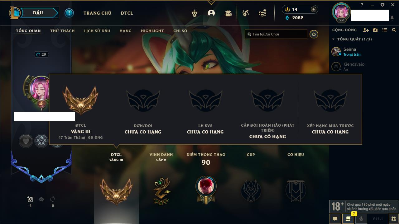 Rank Đơn: Vàng IIIKhung: BạcTướng: 171 - Còn 101359 THXTrang Phục: 88Rank ĐTCL: Kim Cương IVLinh Thú: 200