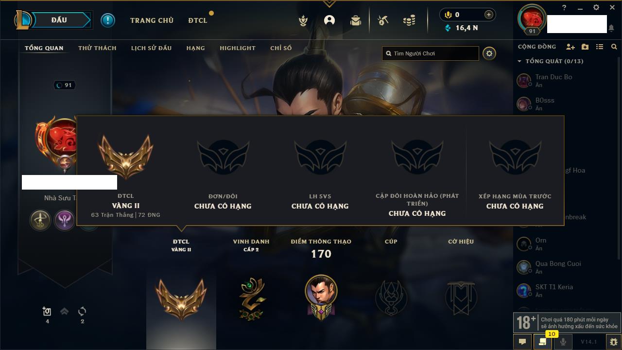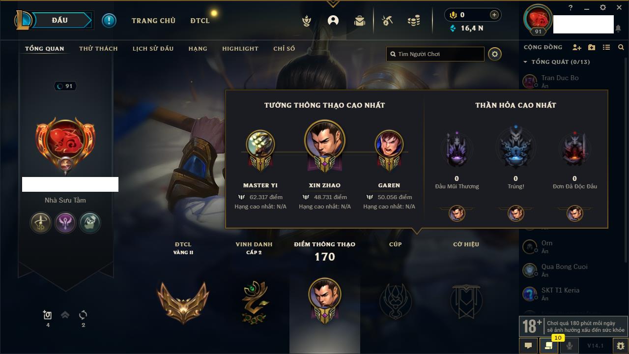 Rank Đơn: Sắt IIIKhung: Chưa có khungTướng: 63 - Còn 185 THXTrang Phục: 8Rank ĐTCL: Chưa RankLinh Thú: 75