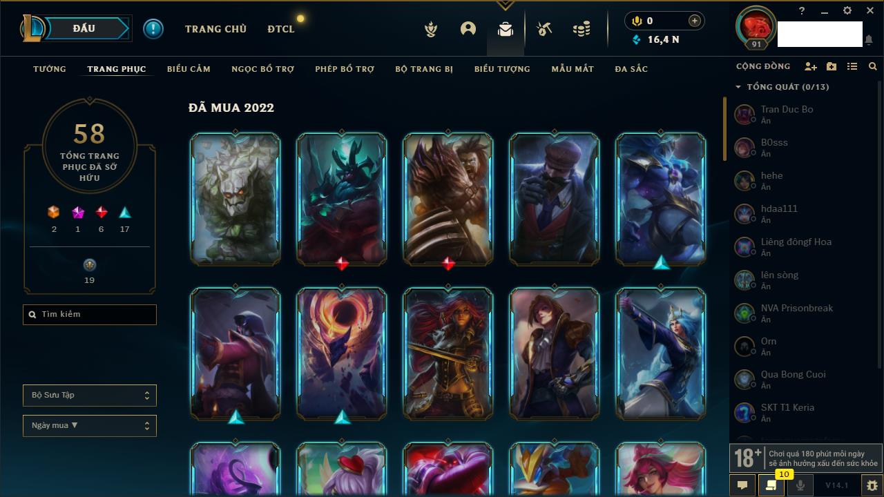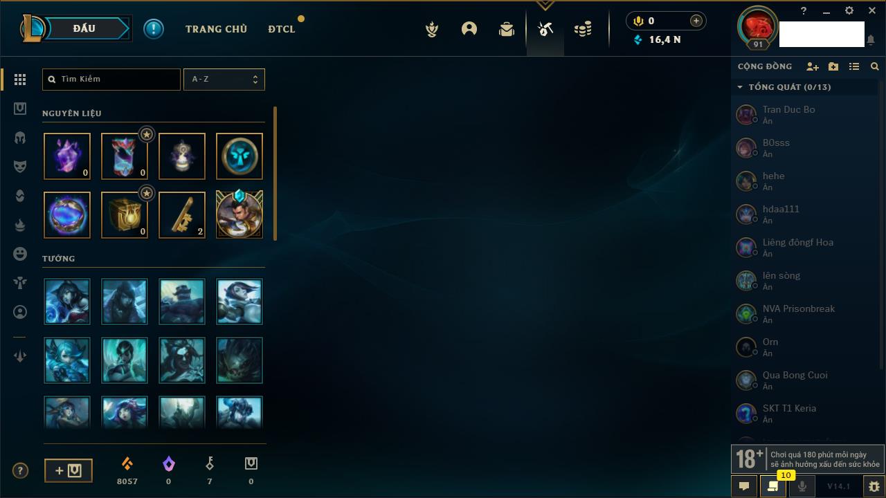 Rank Đơn: Chưa rank mùa nàoKhung: Chưa có khungTướng: 166 - Còn 3090 THXTrang Phục: 9Rank ĐTCL: Chưa RankLinh Thú: 125