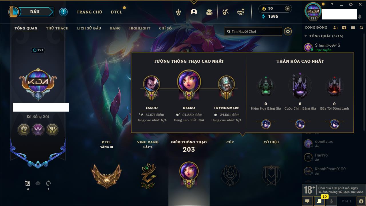 Rank Đơn: Sắt IIIKhung: Chưa có khungTướng: 88 - Còn 1376 THXTrang Phục: 12Rank ĐTCL: Bạc IVLinh Thú: 69