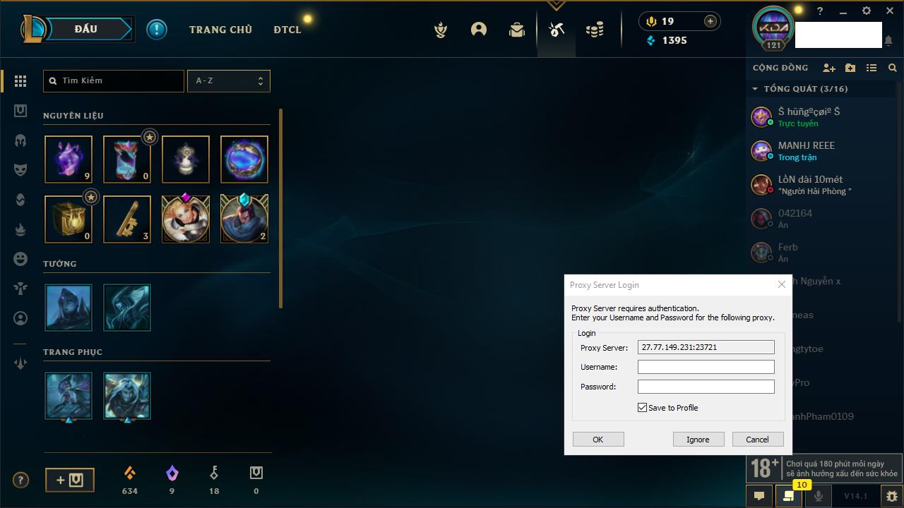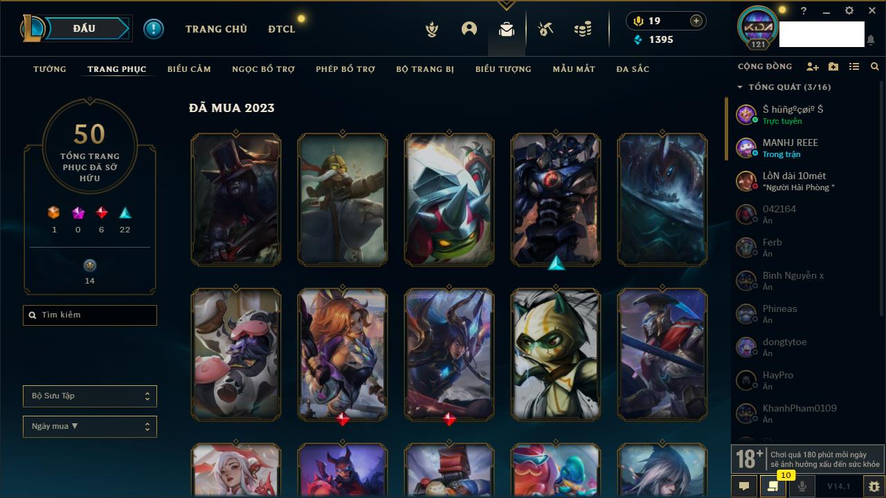 Rank Đơn: Đồng IIIKhung: Chưa có khungTướng: 86 - Còn 14367 THXTrang Phục: 19Rank ĐTCL: Vàng IIILinh Thú: 95