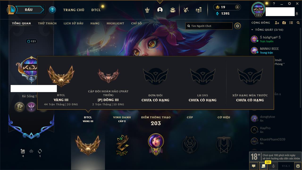 Rank Đơn: Vàng IIIKhung: VàngTướng: 77 - Còn 21172 THXTrang Phục: 8Rank ĐTCL: Kim Cương IIILinh Thú: 23