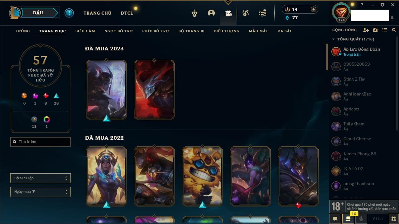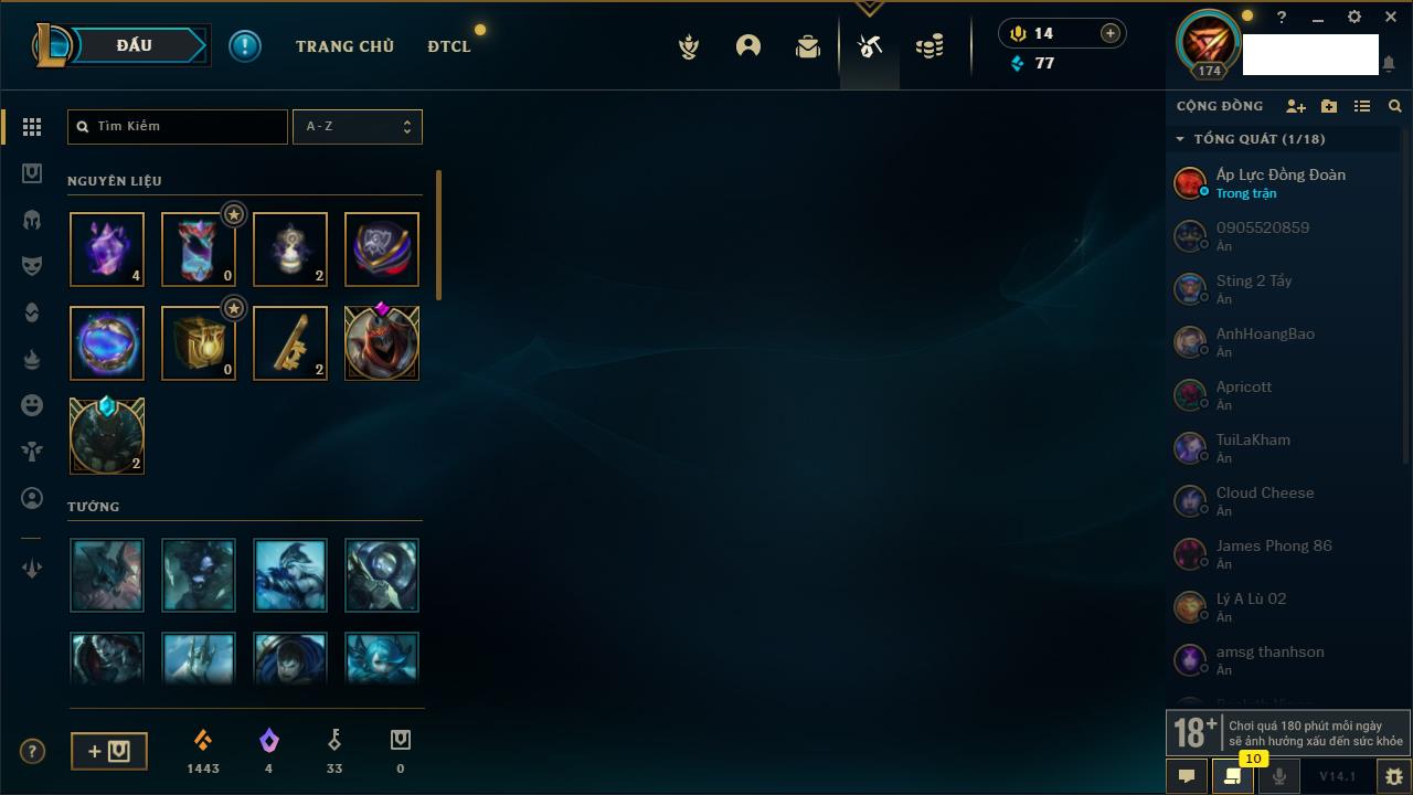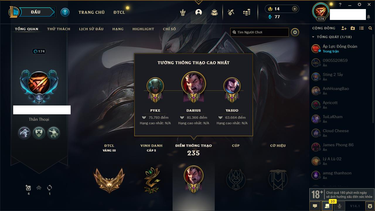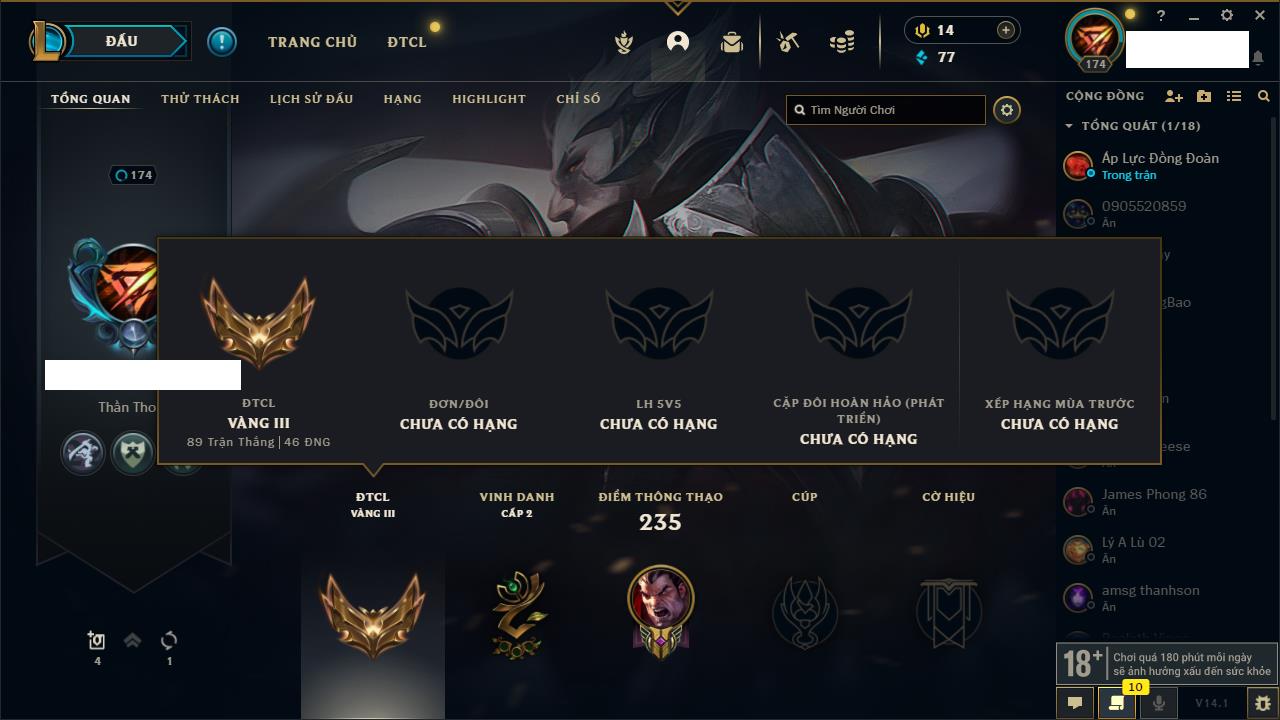 Rank Đơn: Sắt IIIKhung: Chưa có khungTướng: 63 - Còn 185 THXTrang Phục: 8Rank ĐTCL: Chưa RankLinh Thú: 75