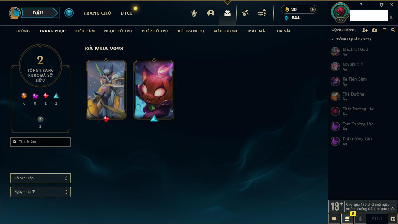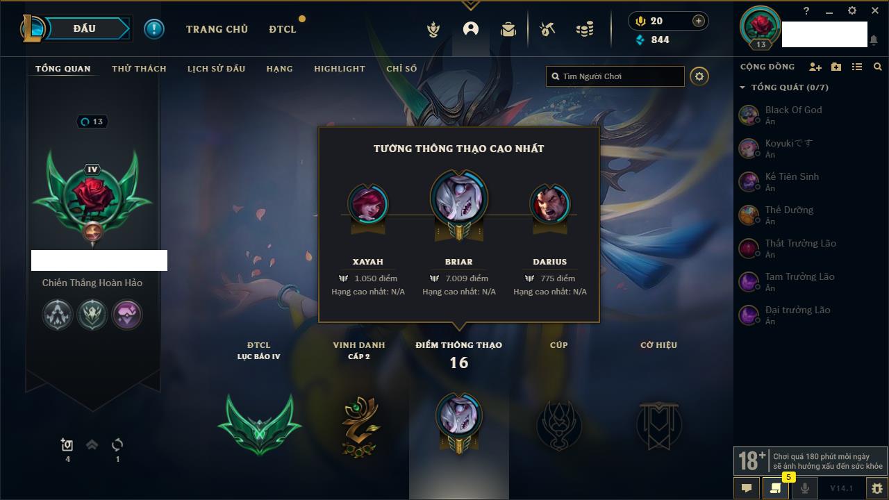 Rank Đơn: Chưa RankKhung: Chưa có khungTướng: 165 - Còn 3214 THXTrang Phục: 160Rank ĐTCL: Chưa RankLinh Thú: 28