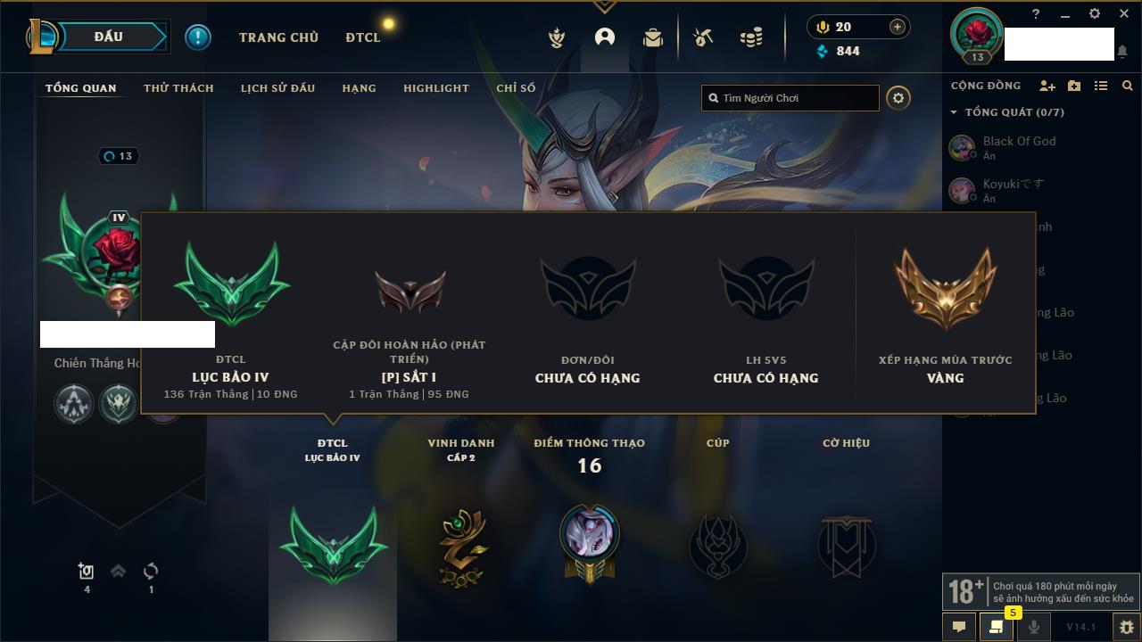 Rank Đơn: Chưa RankKhung: Chưa có khungTướng: 118 - Còn 13712 THXTrang Phục: 117Rank ĐTCL: Chưa RankLinh Thú: 34