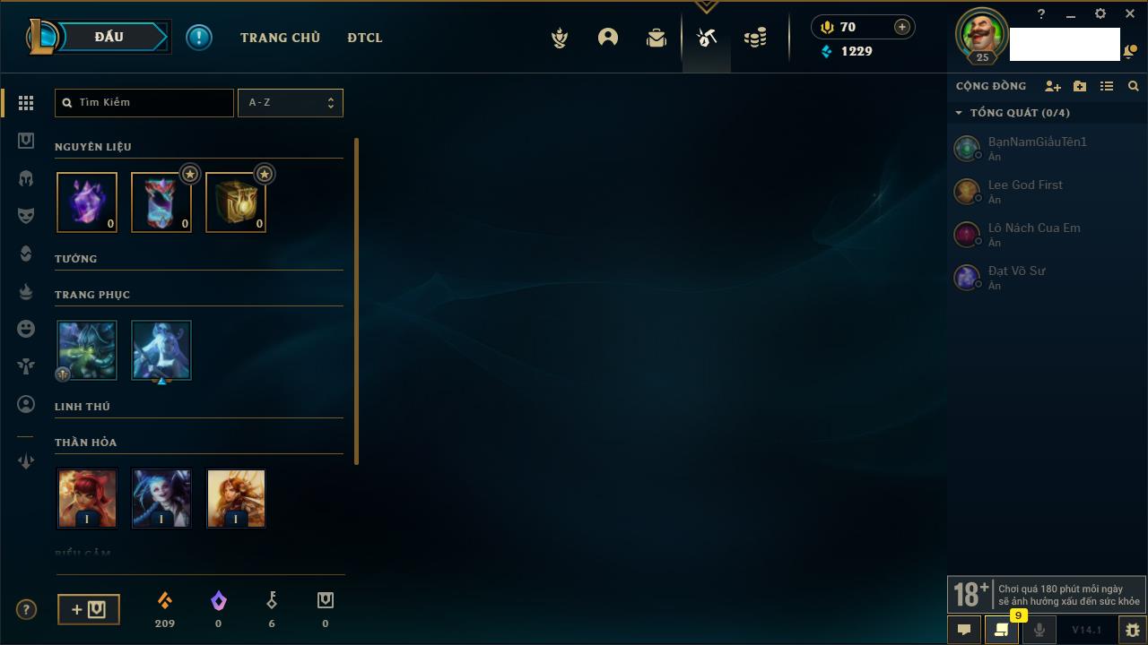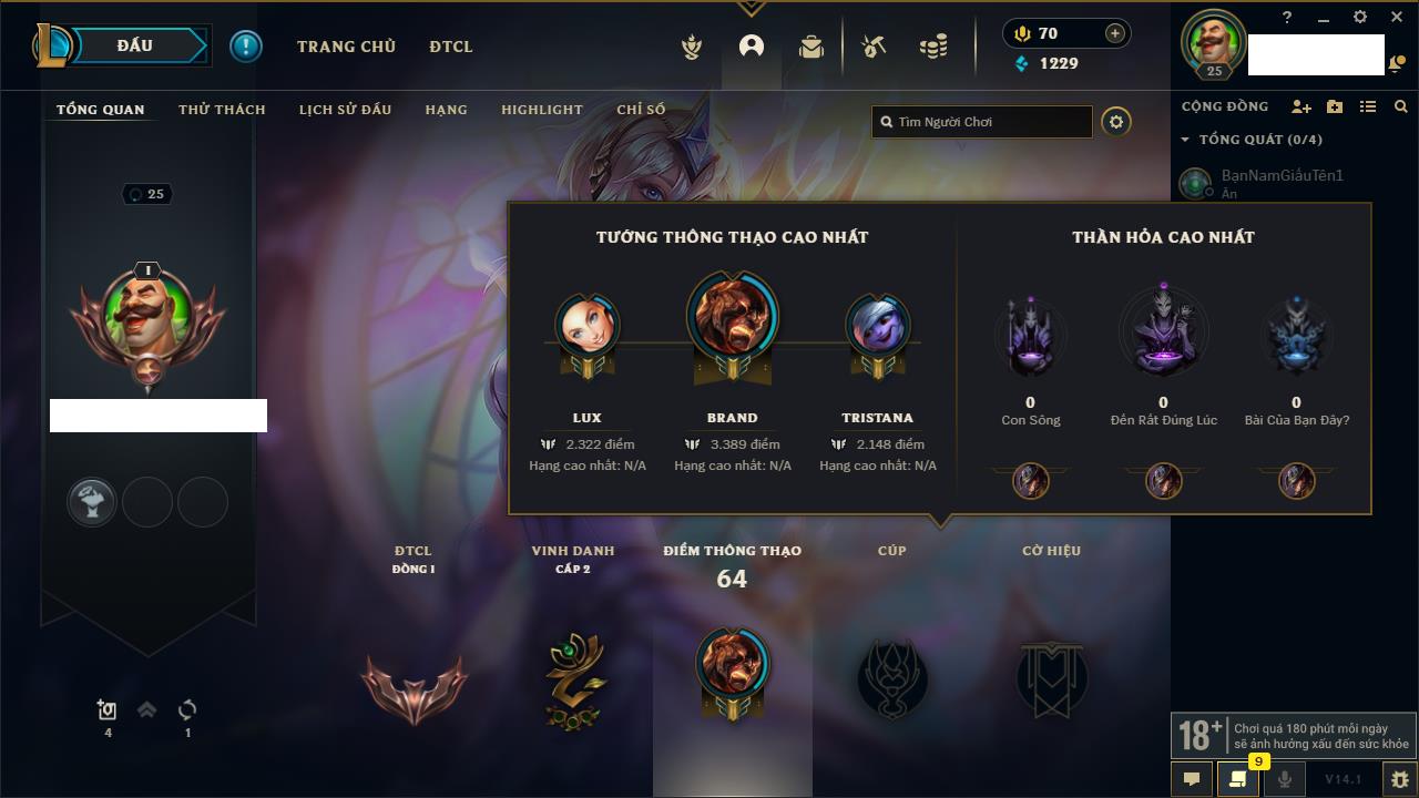 Rank Đơn: Chưa rank mùa nàoKhung: Chưa có khungTướng: 154 - Còn 1660 THXTrang Phục: 6Rank ĐTCL: Chưa RankLinh Thú: 18