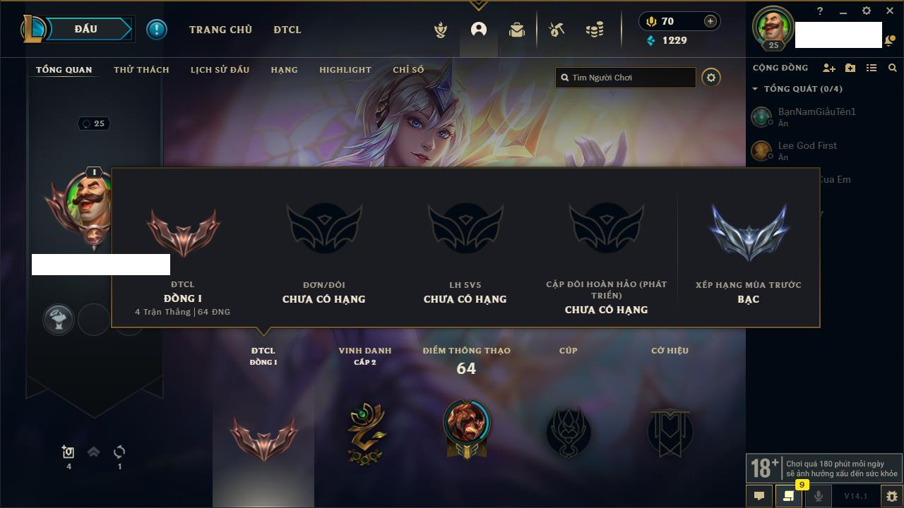 Rank Đơn: Chưa rank mùa nàoKhung: Chưa có khungTướng: 7 - Còn 33750 THXTrang Phục: 0Rank ĐTCL: Bạch Kim ILinh Thú: 25