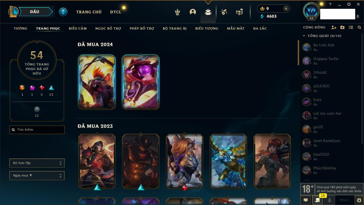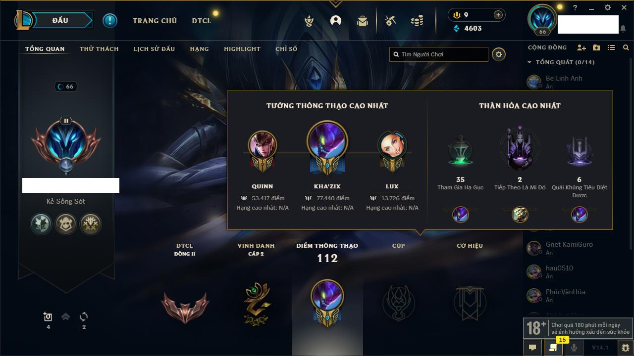 Rank Đơn: Chưa rank mùa nàoKhung: Chưa có khungTướng: 108 - Còn 6515 THXTrang Phục: 23Rank ĐTCL: Chưa RankLinh Thú: 111