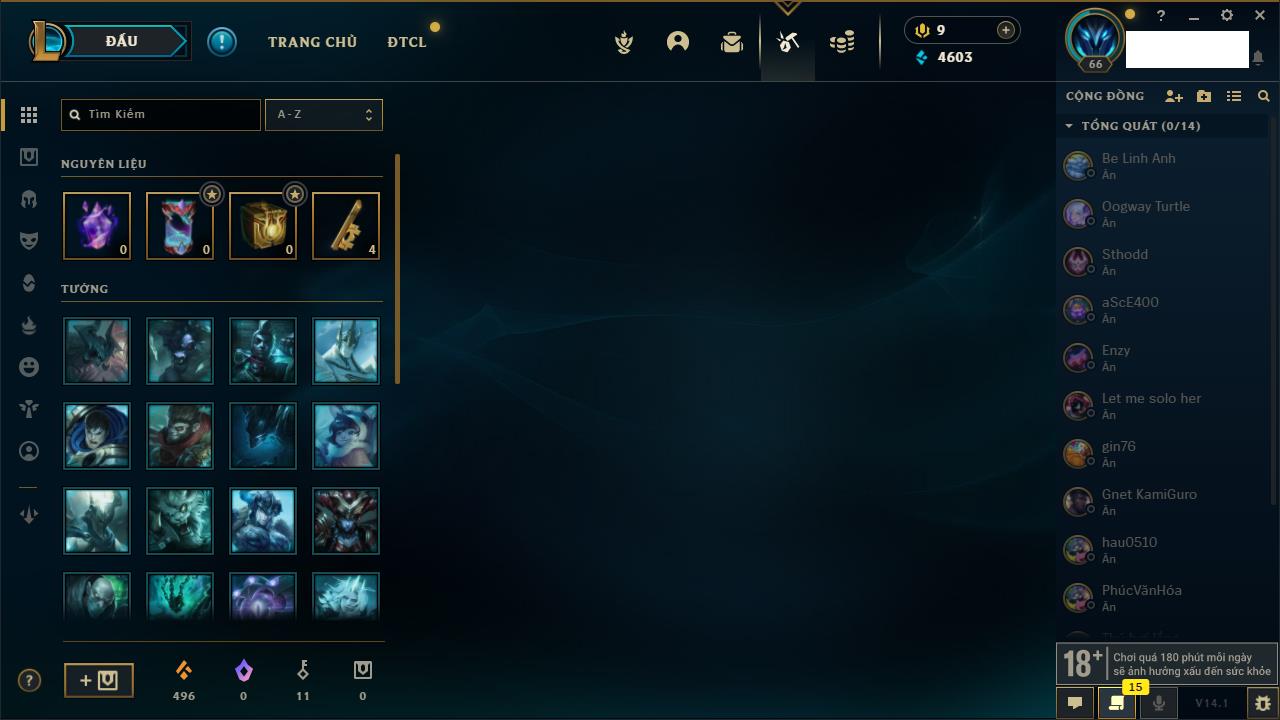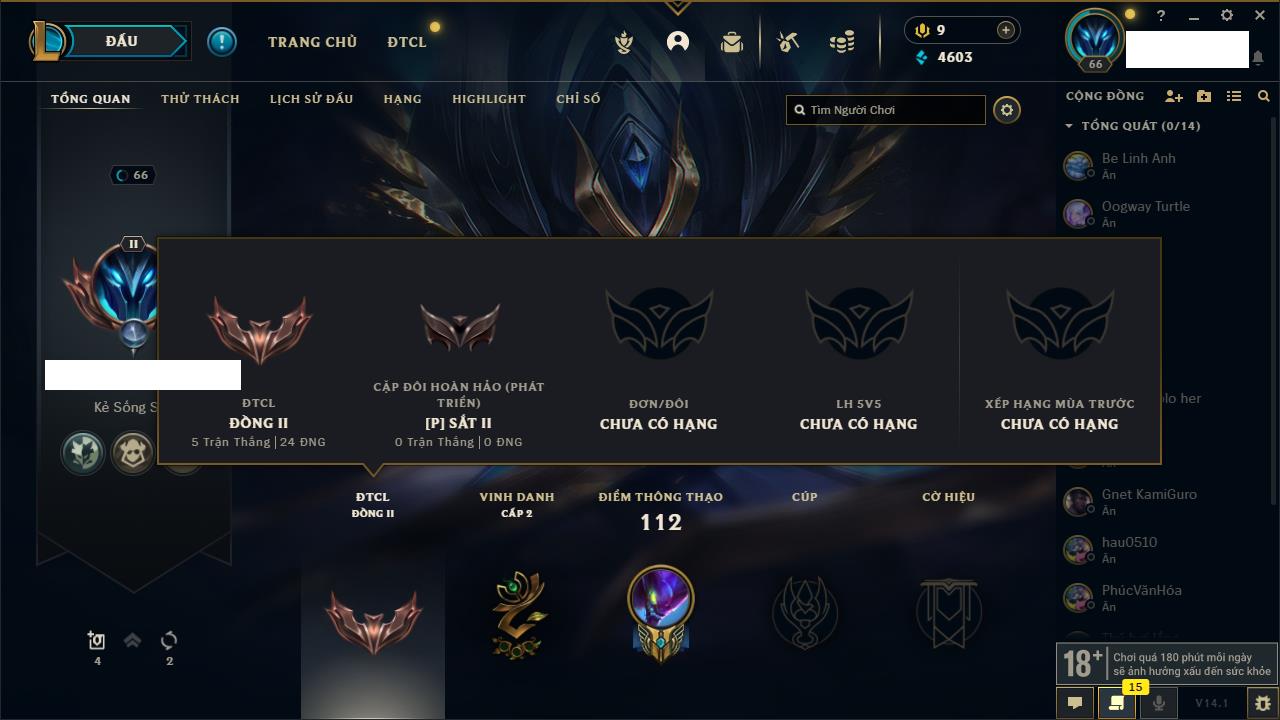 Rank Đơn: Vàng IIIKhung: VàngTướng: 77 - Còn 21172 THXTrang Phục: 8Rank ĐTCL: Kim Cương IIILinh Thú: 23