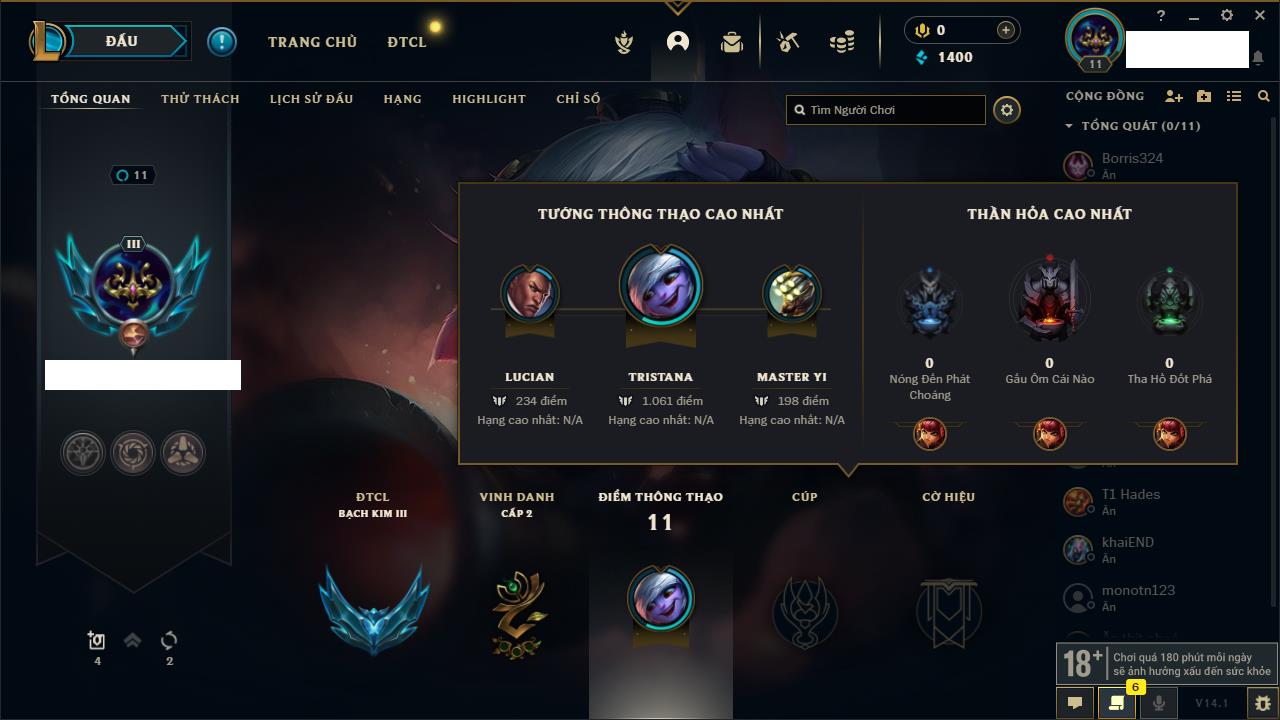 Rank Đơn: Chưa rank mùa nàoKhung: Chưa có khungTướng: 147 - Còn 8700 THXTrang Phục: 0Rank ĐTCL: Chưa RankLinh Thú: 1