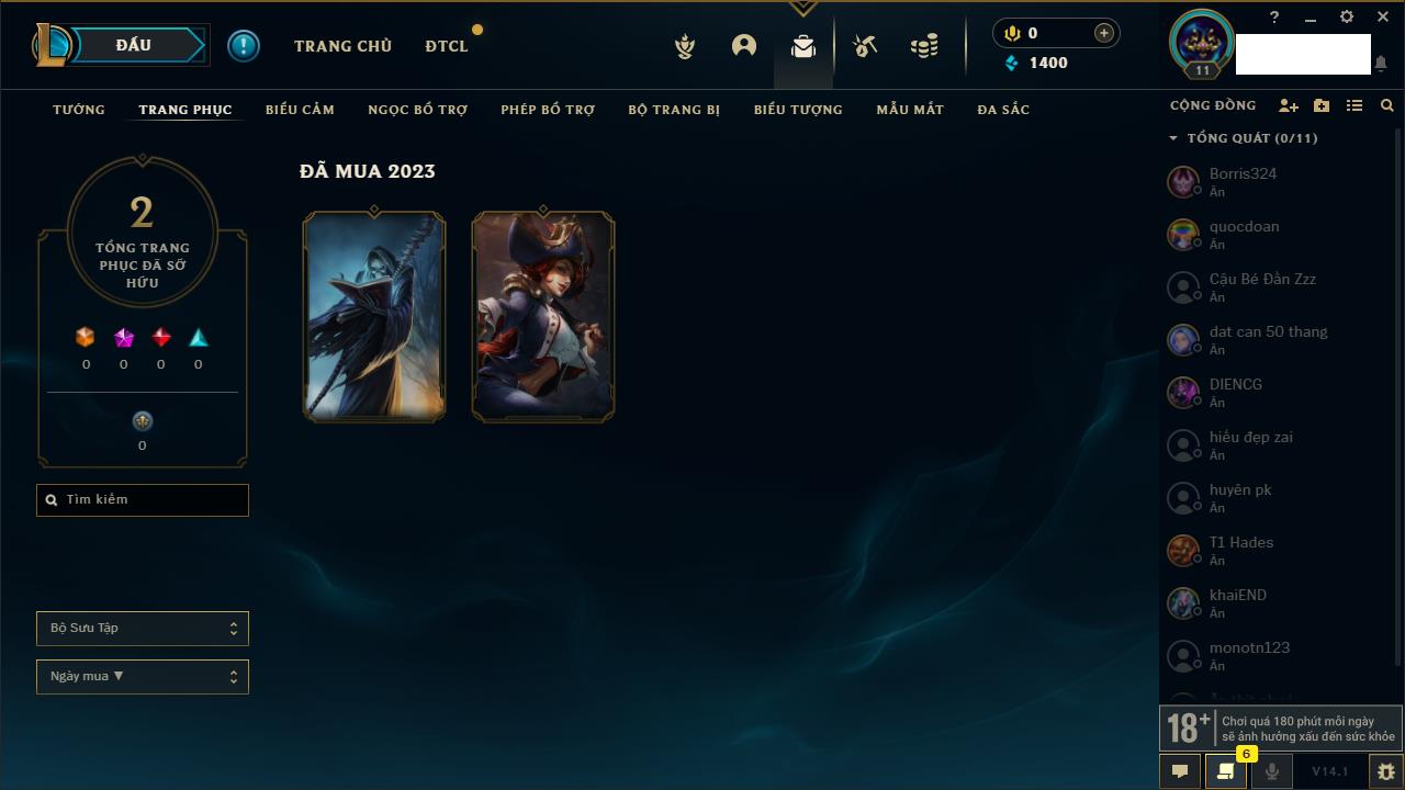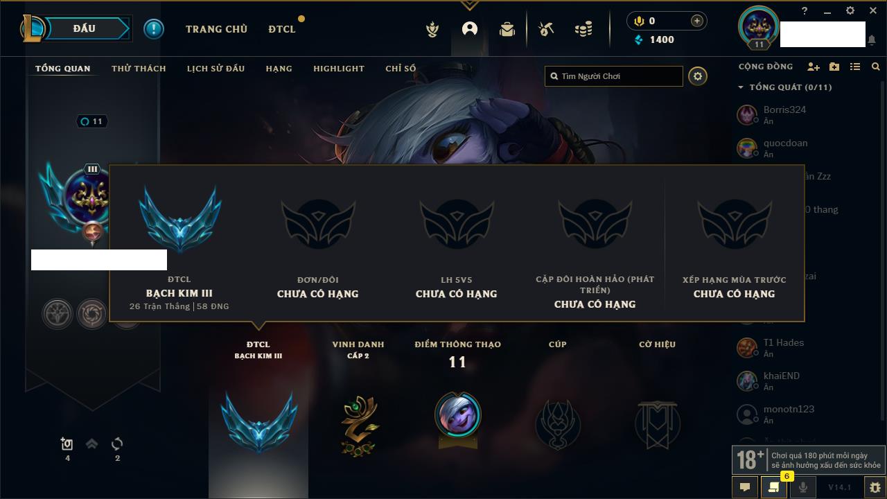 Rank Đơn: Chưa rank mùa nàoKhung: Chưa có khungTướng: 2 - Còn 9000 THXTrang Phục: 0Rank ĐTCL: Lục Bảo IILinh Thú: 9