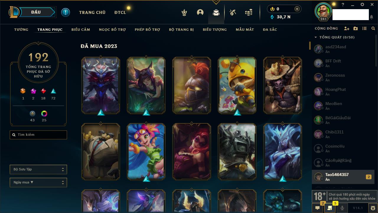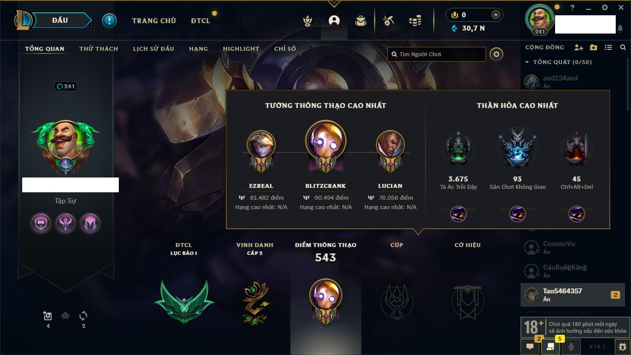 Rank Đơn: Đồng IIIKhung: Chưa có khungTướng: 152 - Còn 6423 THXTrang Phục: 160Rank ĐTCL: Chưa RankLinh Thú: 107