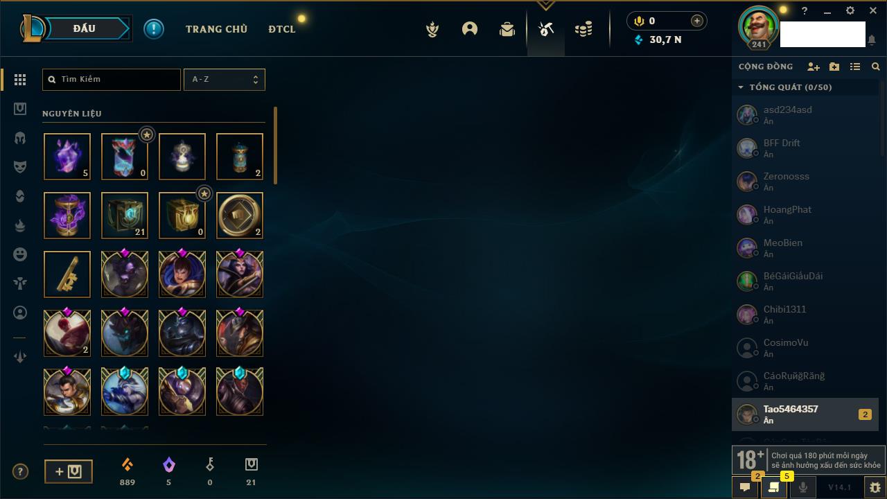 Rank Đơn: Bạc IVKhung: BạcTướng: 171 - Còn 43794 THXTrang Phục: 136Rank ĐTCL: Bạch Kim IVLinh Thú: 108