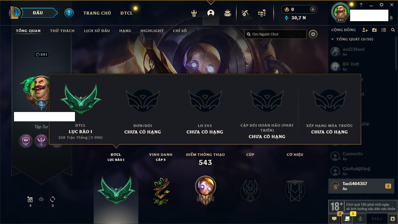 Rank Đơn: Bạc IVKhung: BạcTướng: 171 - Còn 161685 THXTrang Phục: 139Rank ĐTCL: Đồng ILinh Thú: 51