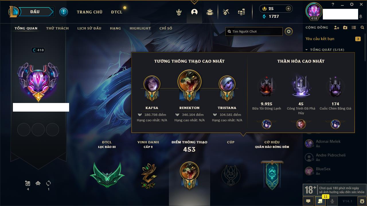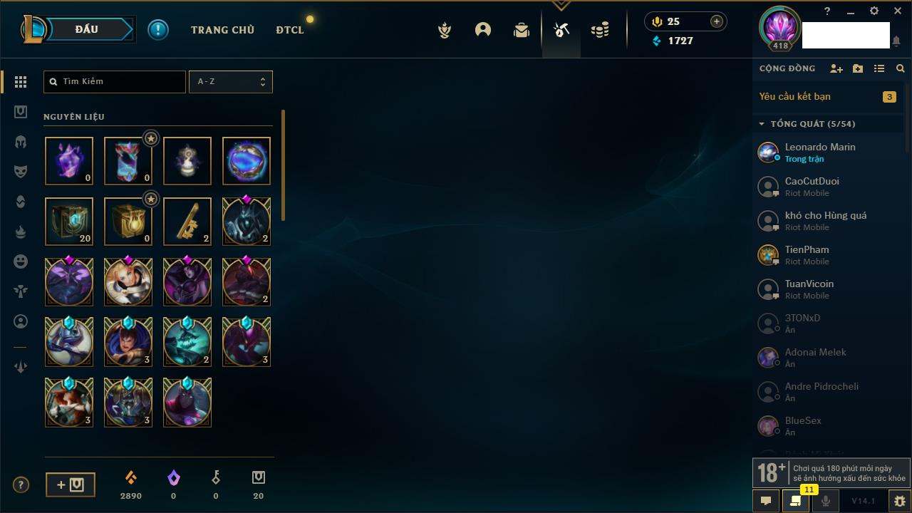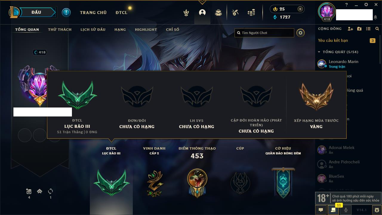 Rank Đơn: Đồng IIKhung: Chưa có khungTướng: 153 - Còn 32832 THXTrang Phục: 66Rank ĐTCL: Chưa RankLinh Thú: 7