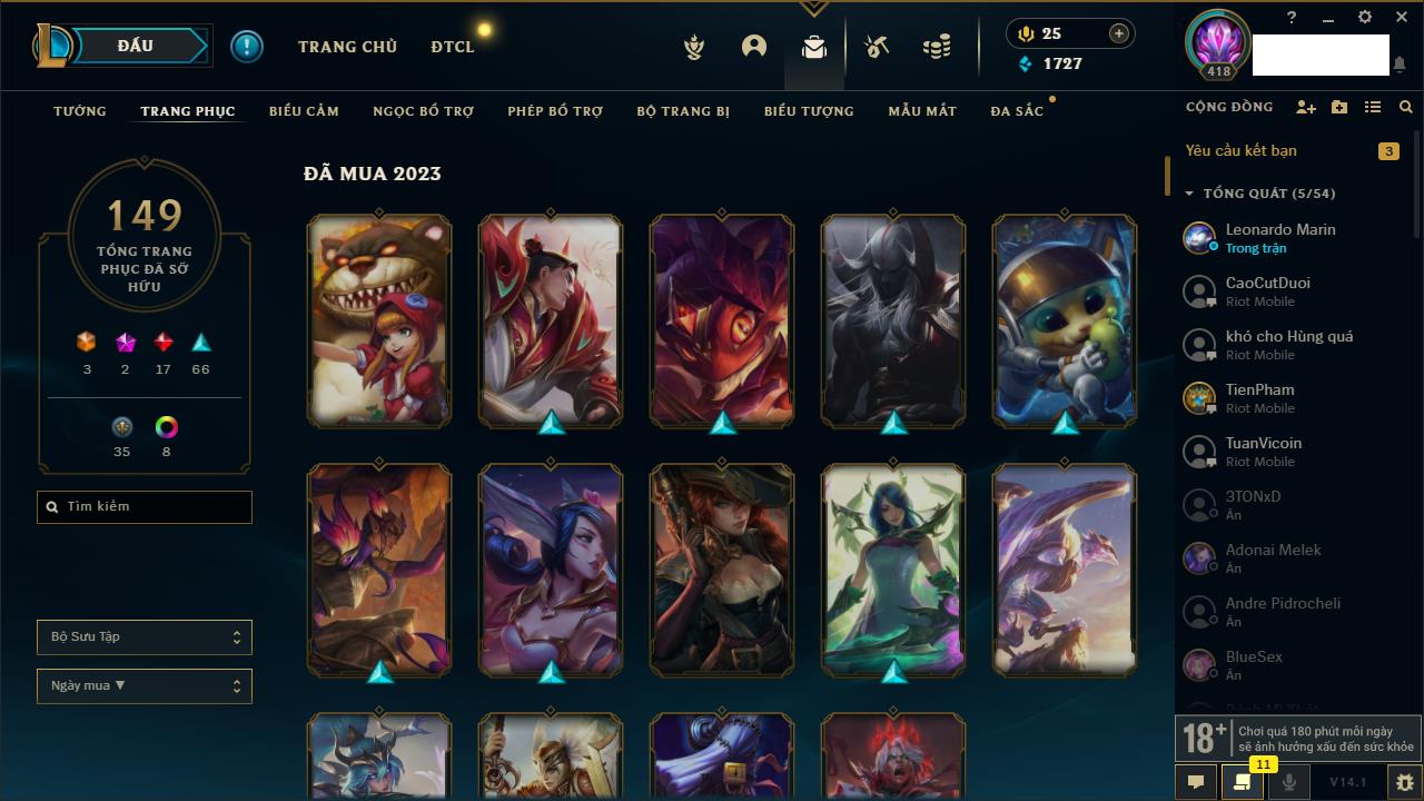 Rank Đơn: Chưa RankKhung: SắtTướng: 148 - Còn 2999 THXTrang Phục: 139Rank ĐTCL: Chưa RankLinh Thú: 43