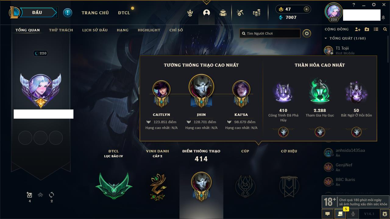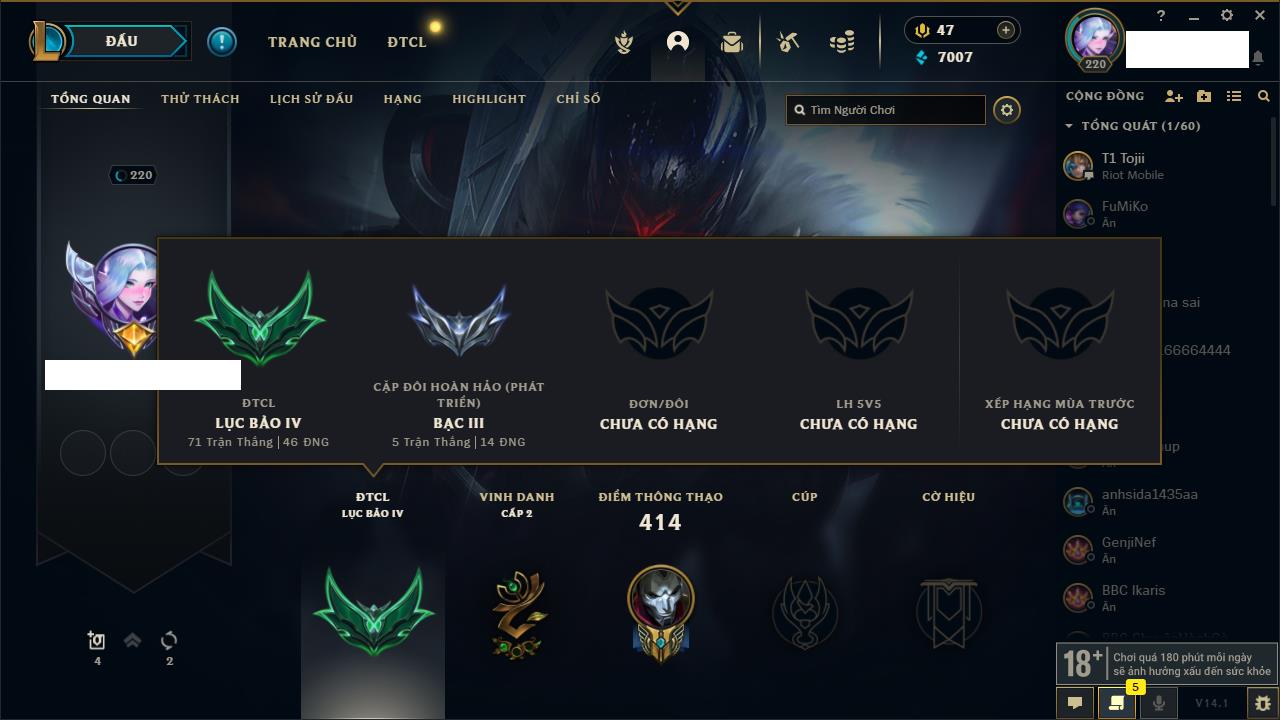 Rank Đơn: Chưa Rank Khung: Bạc Tướng: 171 - Còn 140501 THX Trang Phục: 58 Rank ĐTCL: Chưa Rank Linh Thú: 87