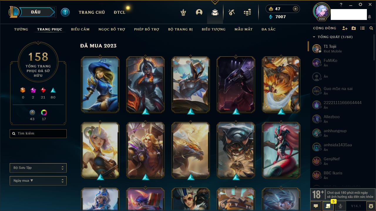 Rank Đơn: Chưa Rank Khung: Chưa có khung Tướng: 171 - Còn 52162 THX Trang Phục: 78 Rank ĐTCL: Chưa Rank Linh Thú: 145