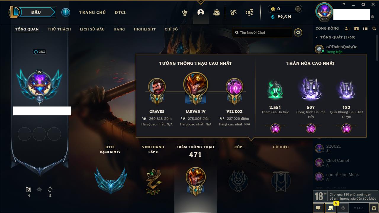 Rank Đơn: Vàng IKhung: Bạch kimTướng: 172 - Còn 108407 THXTrang Phục: 237Rank ĐTCL: Chưa RankLinh Thú: 44
