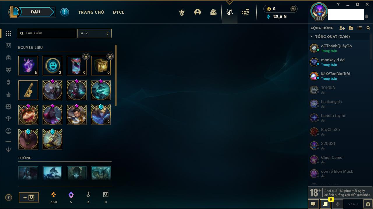 Rank Đơn: Bạc IIIKhung: BạcTướng: 171 - Còn 308470 THXTrang Phục: 164Rank ĐTCL: Chưa RankLinh Thú: 51