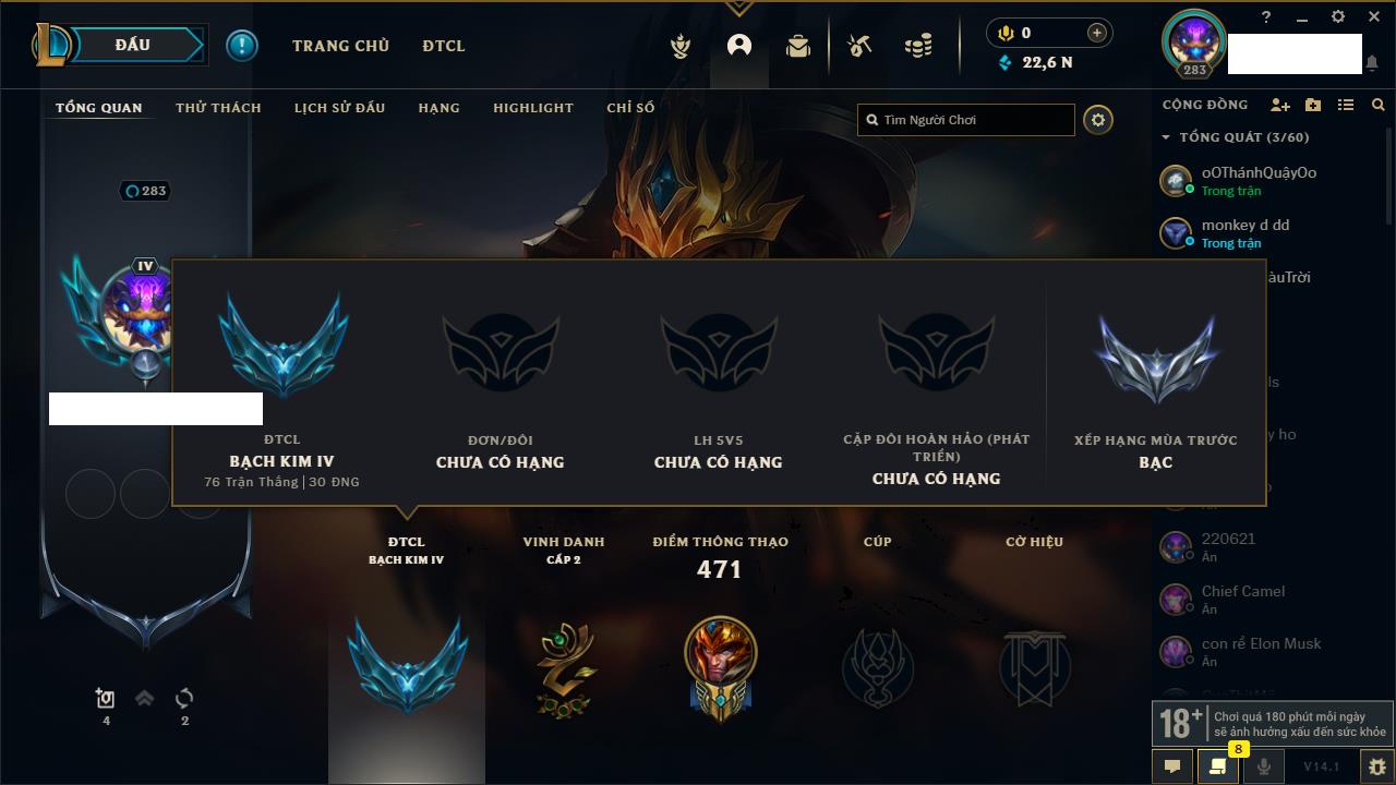 Rank Đơn: Bạc IIKhung: VàngTướng: 171 - Còn 70460 THXTrang Phục: 169Rank ĐTCL: Vàng ILinh Thú: 46