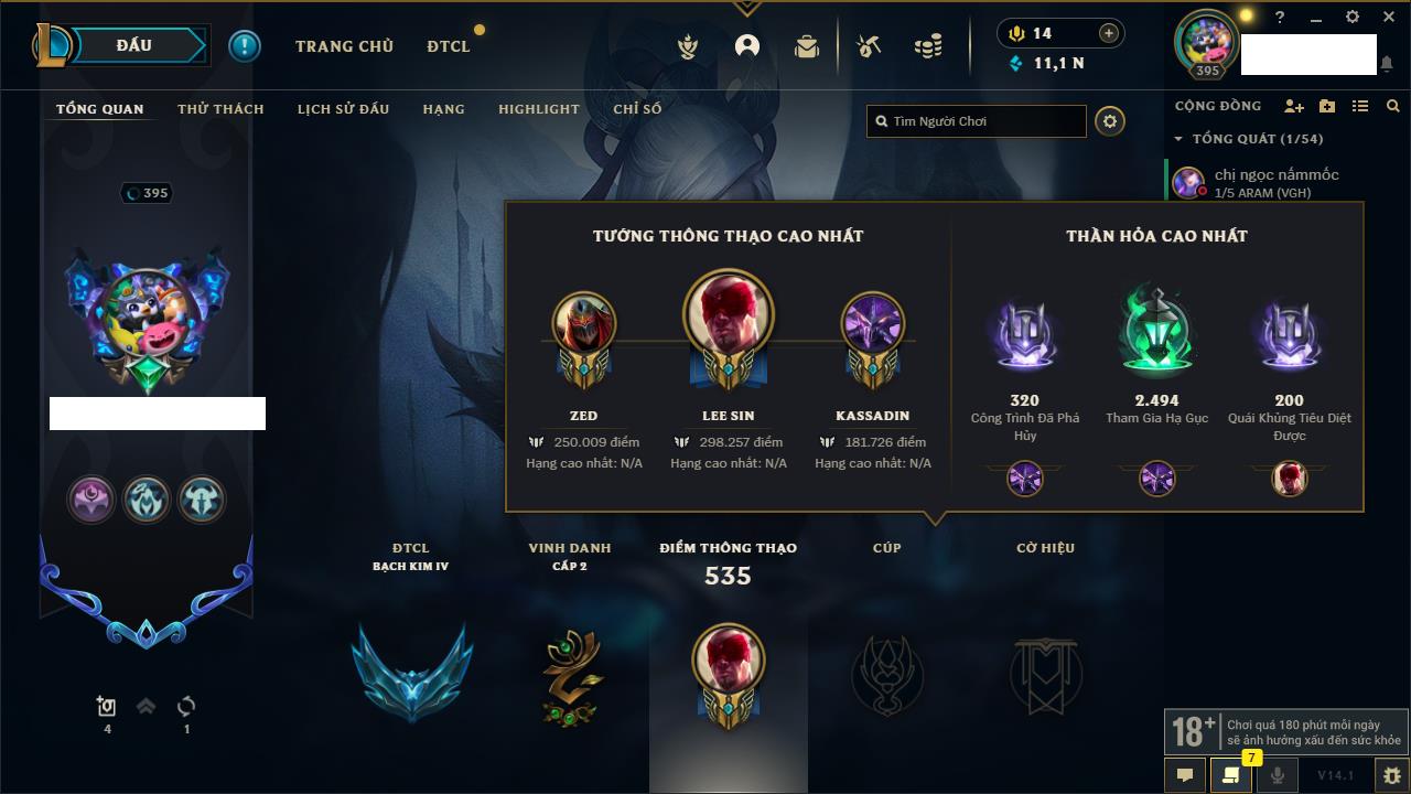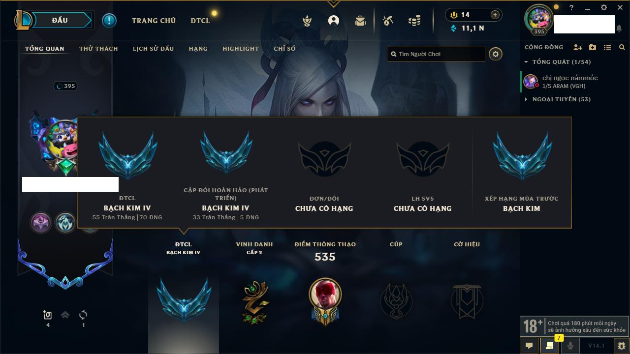 Rank Đơn: Bạch Kim IIIKhung: Bạch kimTướng: 171 - Còn 136108 THXTrang Phục: 261Rank ĐTCL: Bạc IVLinh Thú: 73