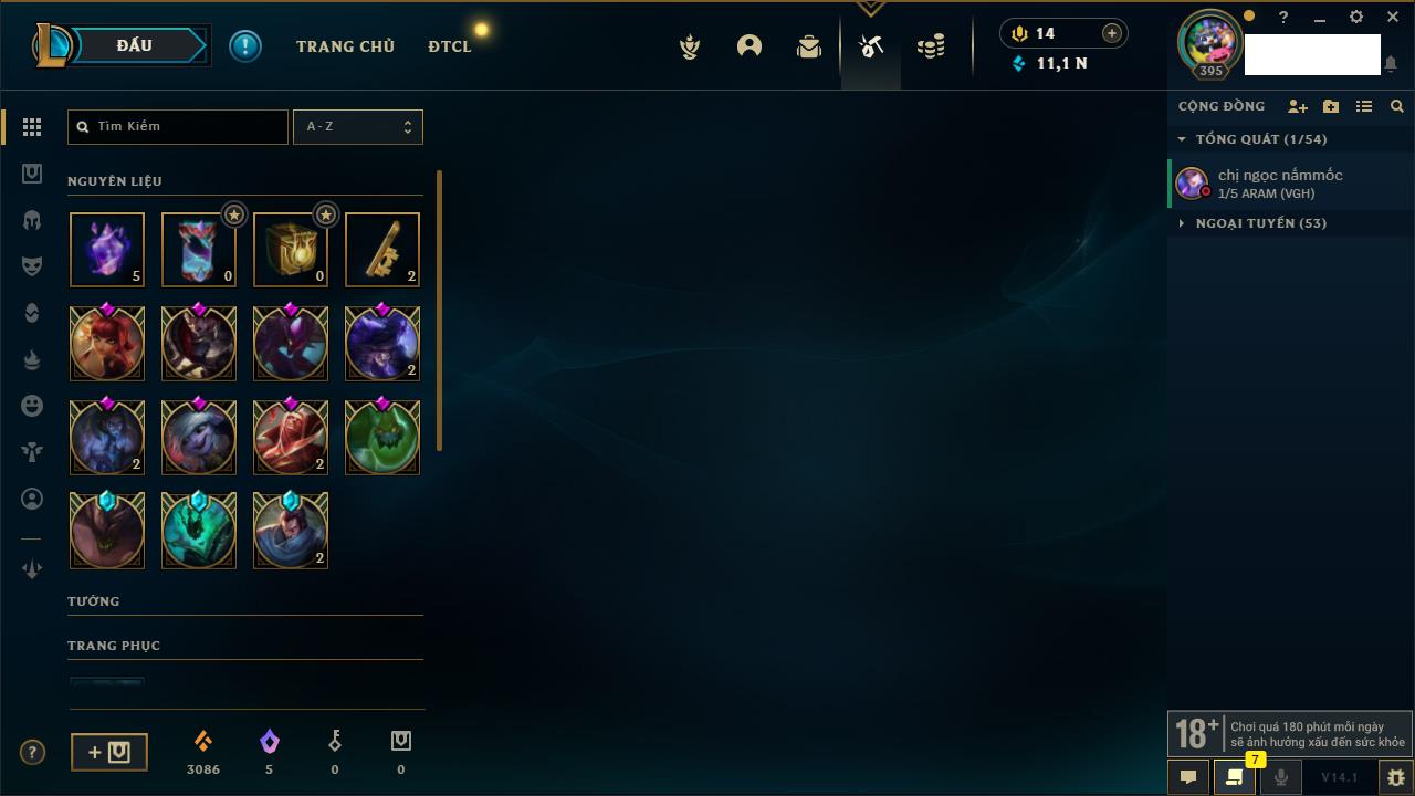 Rank Đơn: Đồng IIKhung: Chưa có khungTướng: 170 - Còn 2078 THXTrang Phục: 72Rank ĐTCL: Đồng ILinh Thú: 133
