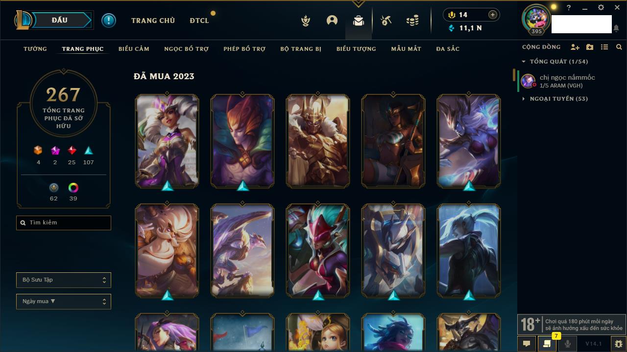Rank Đơn: Vàng IIKhung: VàngTướng: 170 - Còn 243330 THXTrang Phục: 230Rank ĐTCL: Chưa RankLinh Thú: 68