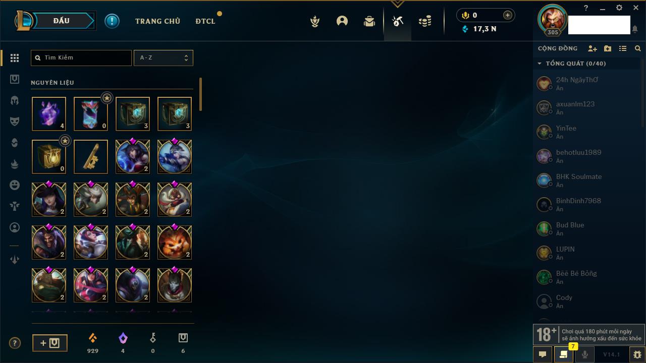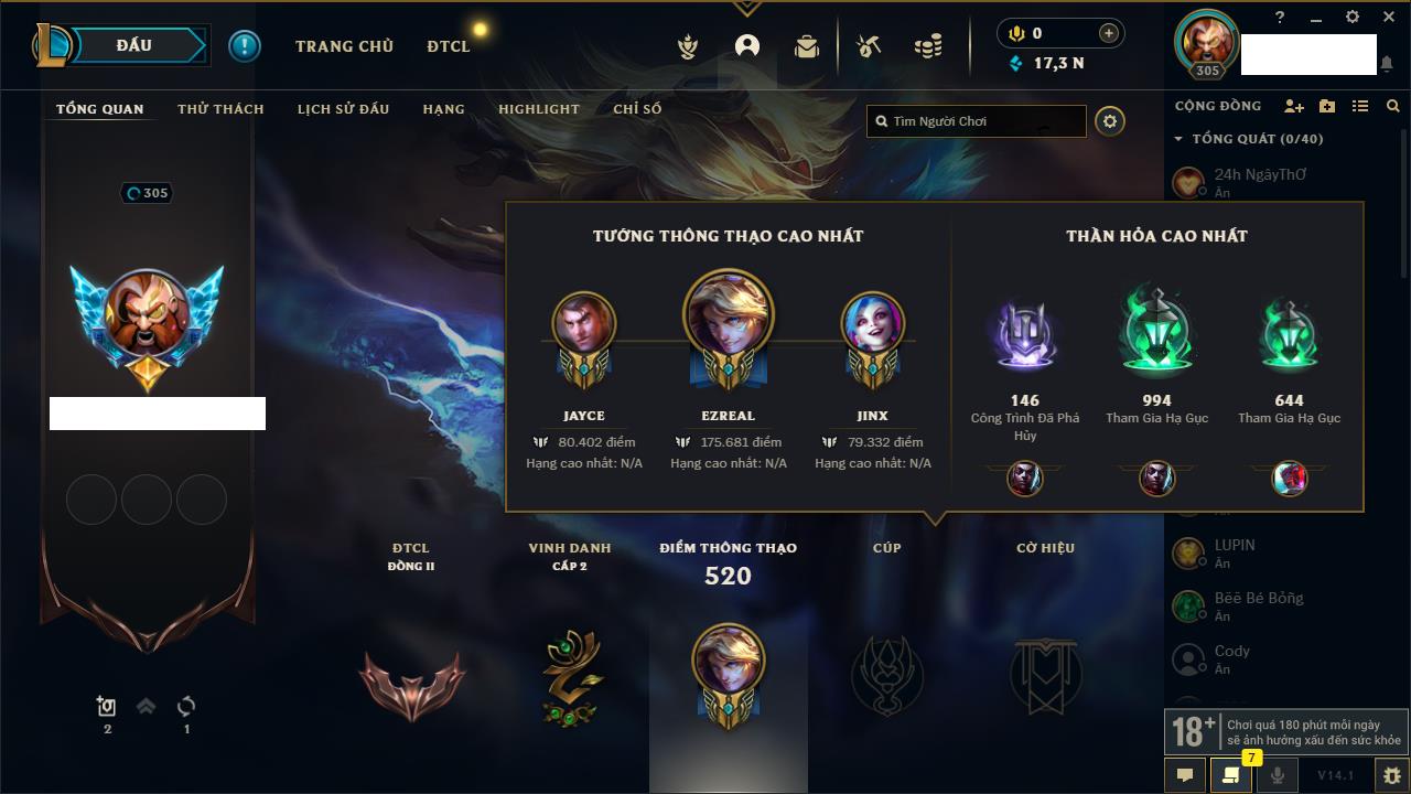 Rank Đơn: Lục Bảo IVKhung: VàngTướng: 171 - Còn 154648 THXTrang Phục: 203Rank ĐTCL: Bạch Kim IVLinh Thú: 69