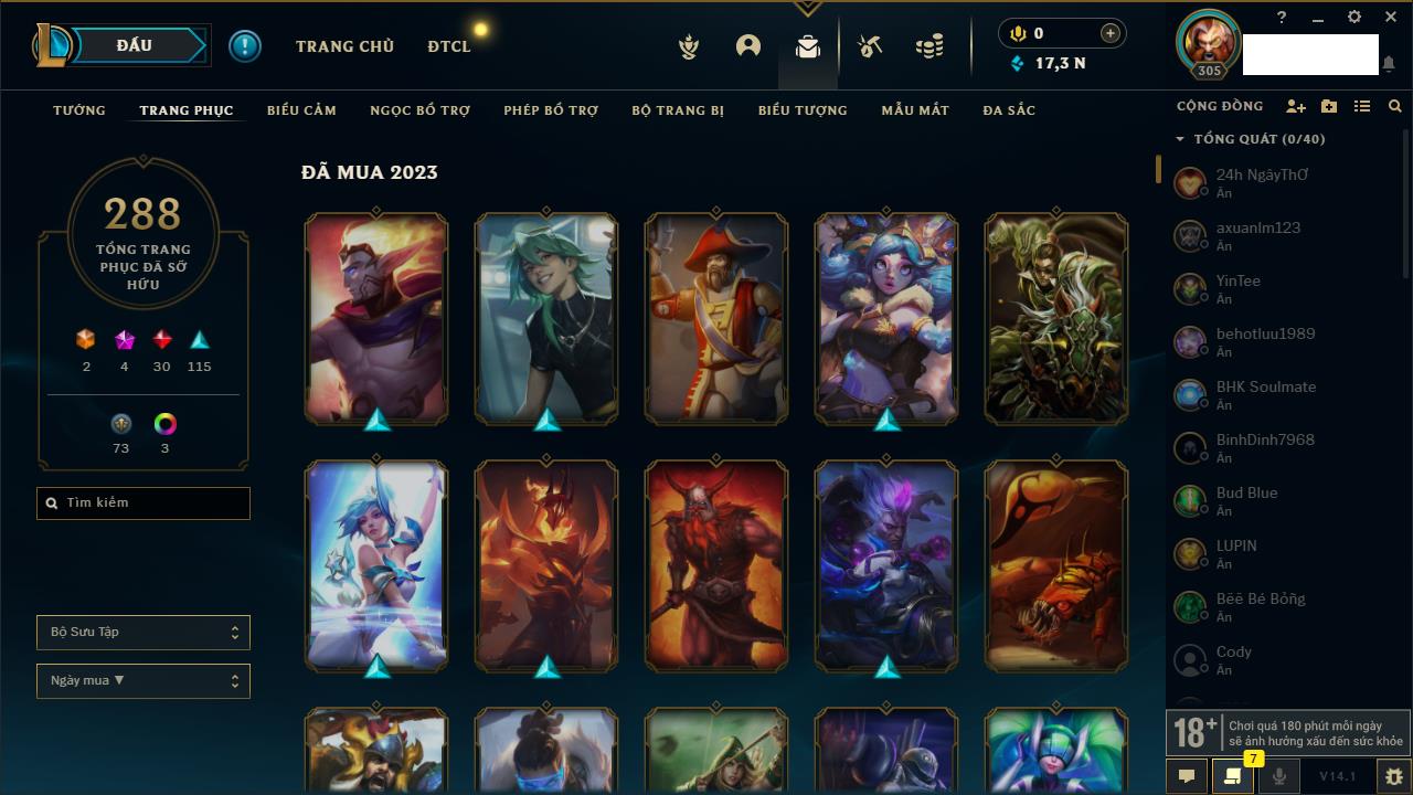 Rank Đơn: Bạch Kim IIIKhung: Bạch kimTướng: 171 - Còn 136108 THXTrang Phục: 261Rank ĐTCL: Bạc IVLinh Thú: 73