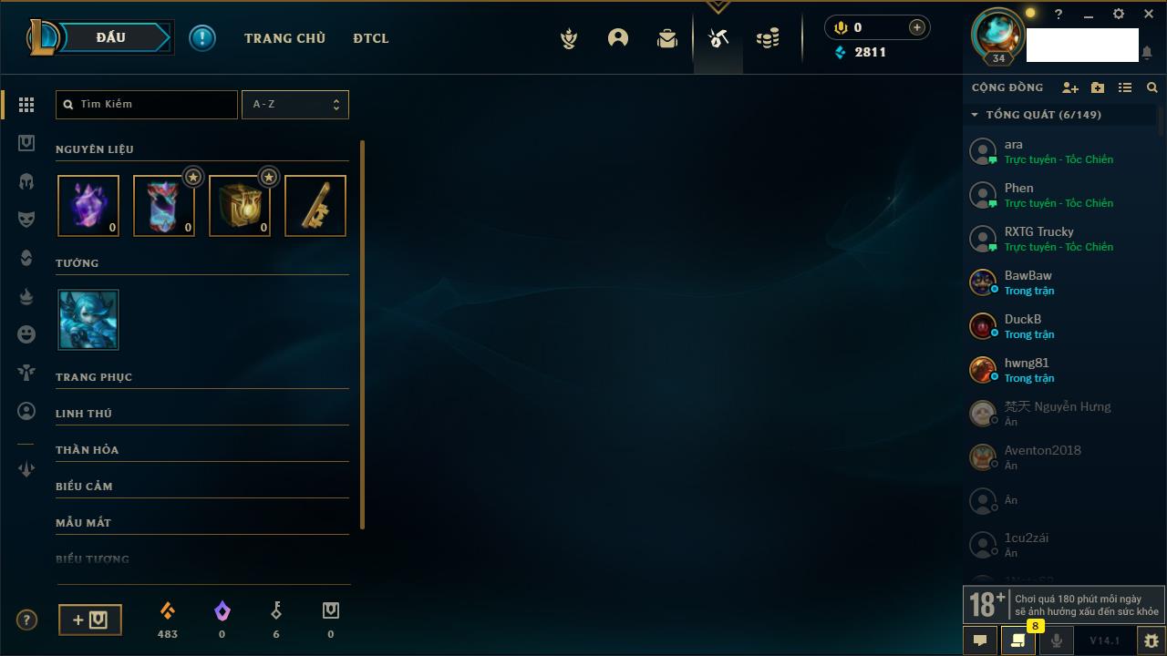 Rank Đơn: Sắt IIIKhung: Chưa có khungTướng: 77 - Còn 8133 THXTrang Phục: 11Rank ĐTCL: Bạch Kim IVLinh Thú: 108