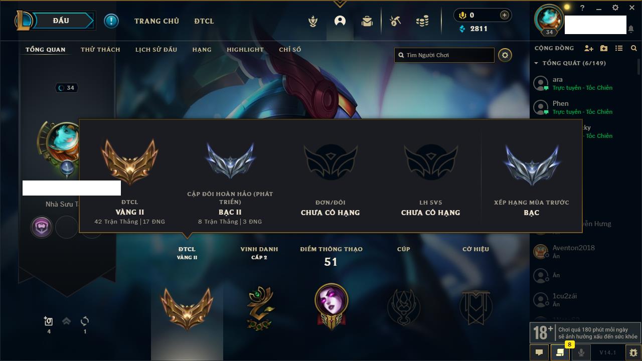 Rank Đơn: Bạc IVKhung: BạcTướng: 76 - Còn 1316 THXTrang Phục: 14Rank ĐTCL: Vàng IILinh Thú: 96
