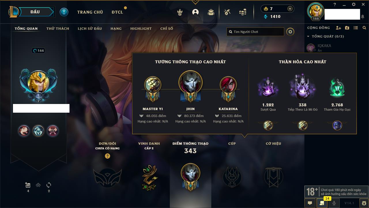 Rank Đơn: Vàng IVKhung: Chưa có khungTướng: 169 - Còn 2148 THXTrang Phục: 205Rank ĐTCL: Chưa RankLinh Thú: 50