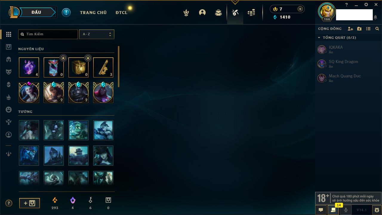Rank Đơn: Vàng IIIKhung: BạcTướng: 171 - Còn 101359 THXTrang Phục: 88Rank ĐTCL: Kim Cương IVLinh Thú: 200