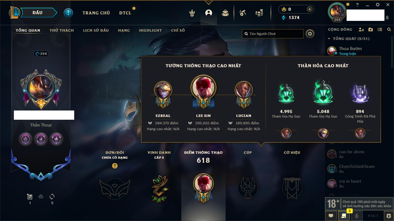 Rank Đơn: Vàng IVKhung: VàngTướng: 171 - Còn 660284 THXTrang Phục: 199Rank ĐTCL: Chưa RankLinh Thú: 34