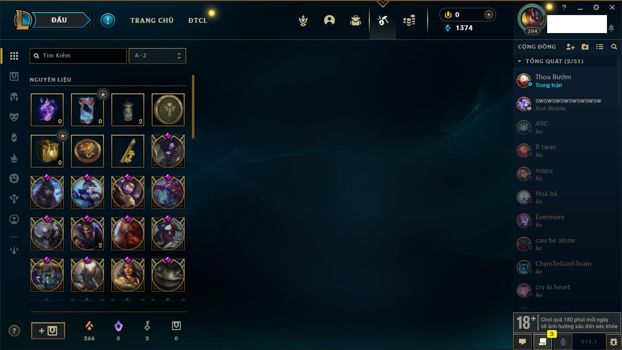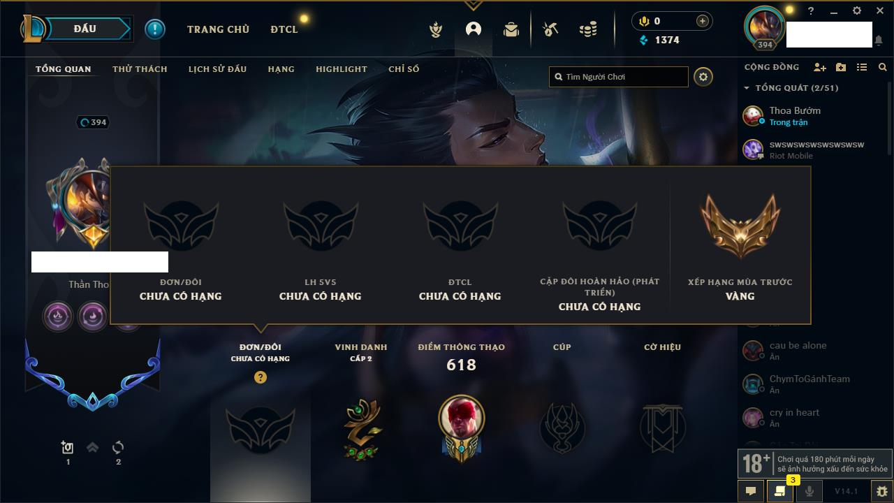 Rank Đơn: Vàng IIIKhung: VàngTướng: 171 - Còn 224994 THXTrang Phục: 273Rank ĐTCL: Vàng IVLinh Thú: 192