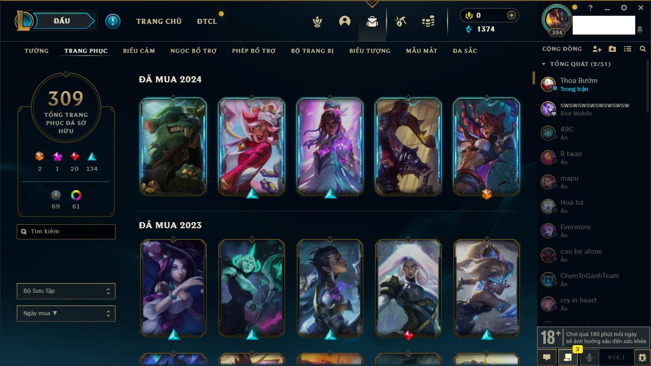 Rank Đơn: Vàng IIIKhung: VàngTướng: 171 - Còn 88128 THXTrang Phục: 329Rank ĐTCL: Chưa RankLinh Thú: 41