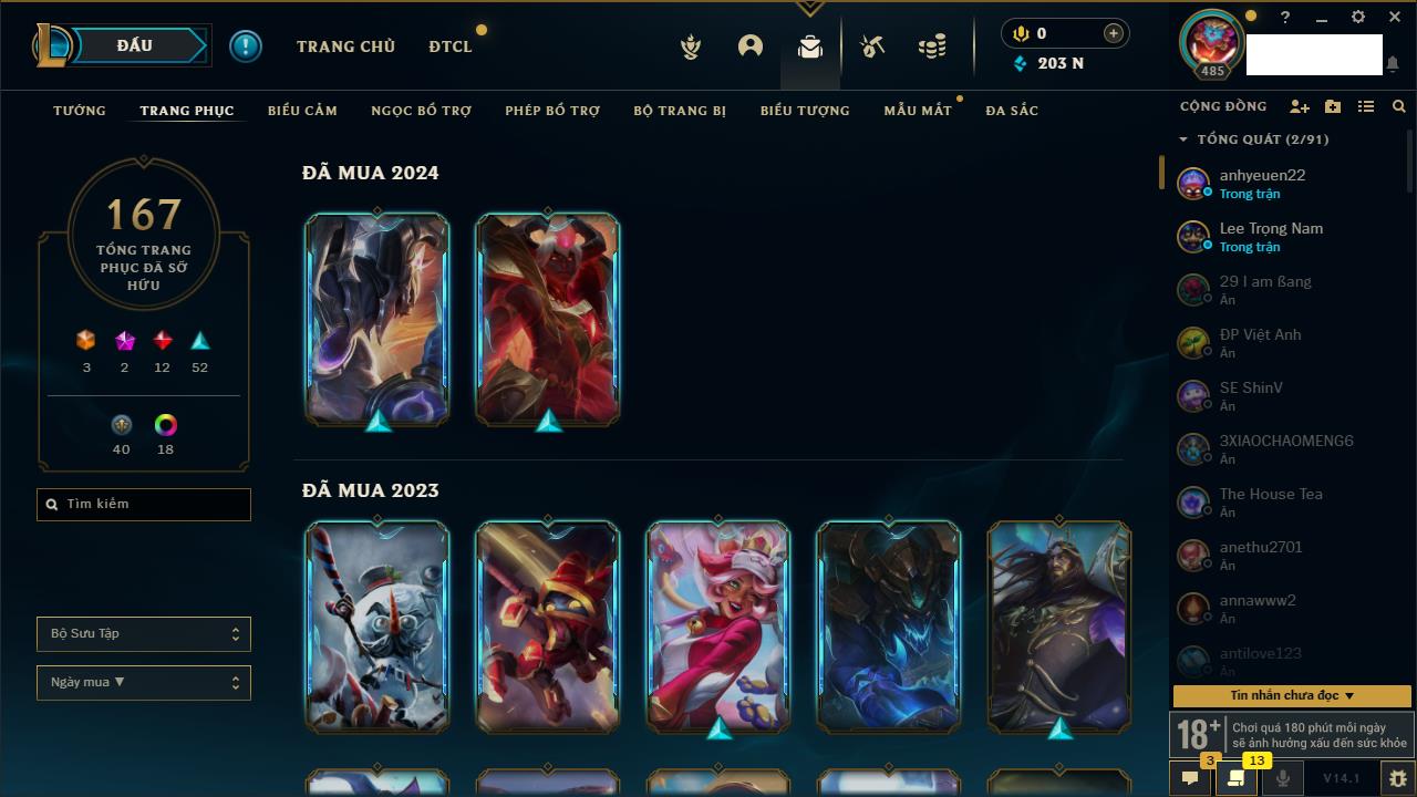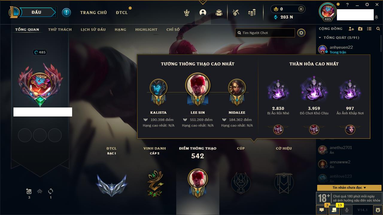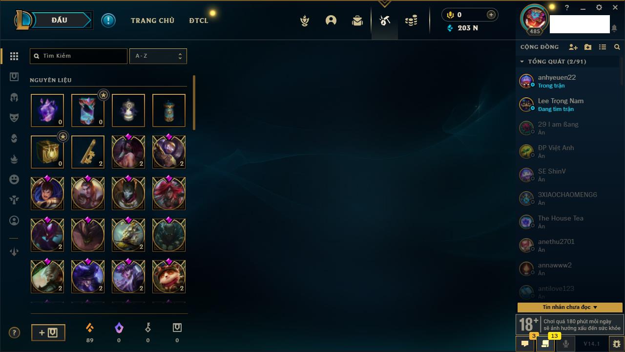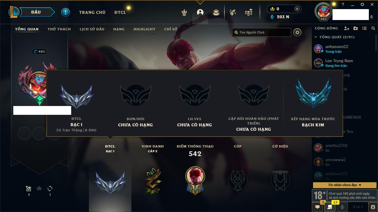 Rank Đơn: Đồng IV Khung: Chưa có khung Tướng: 171 - Còn 88838 THX Trang Phục: 103 Rank ĐTCL: Vàng IV Linh Thú: 139